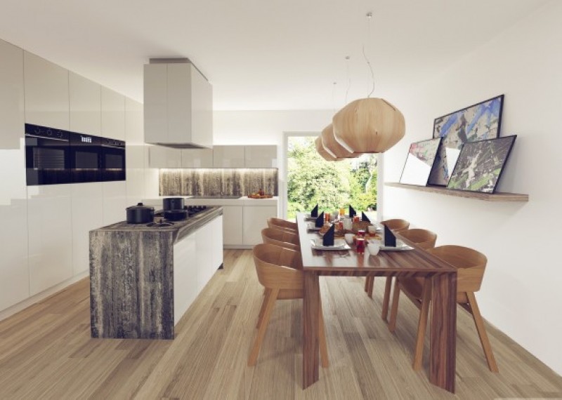 V přízemí je navržen obývací prostor, který je propojen s jídelnou a kuchyňským koutem. Velká francouzská okna zajišťují prosvětlení interiéru, výhled do okolí a také vstup na terasu.
