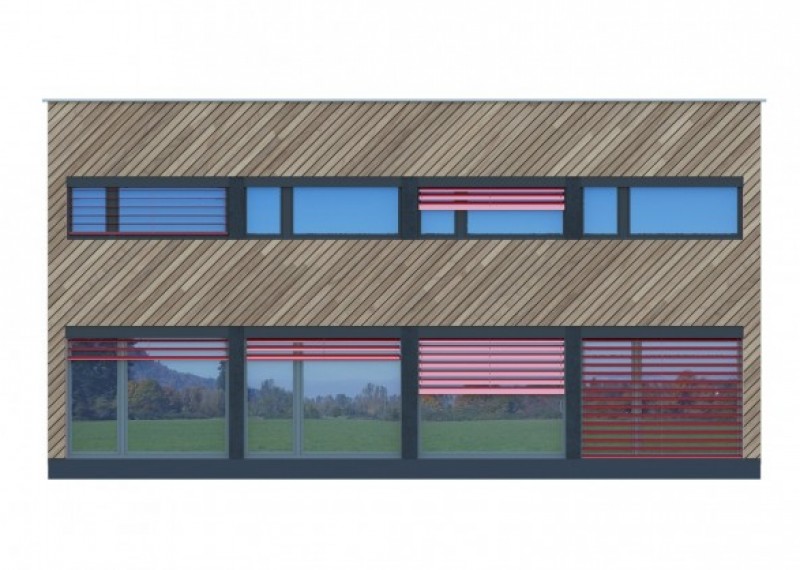 Moderní, dvoupodlažní rodinný dům s plochou střechou a čistými, jednoduchými liniemi. Atraktivní vzhled domu podtrhuje dřevěný obklad použitý na fasádě.