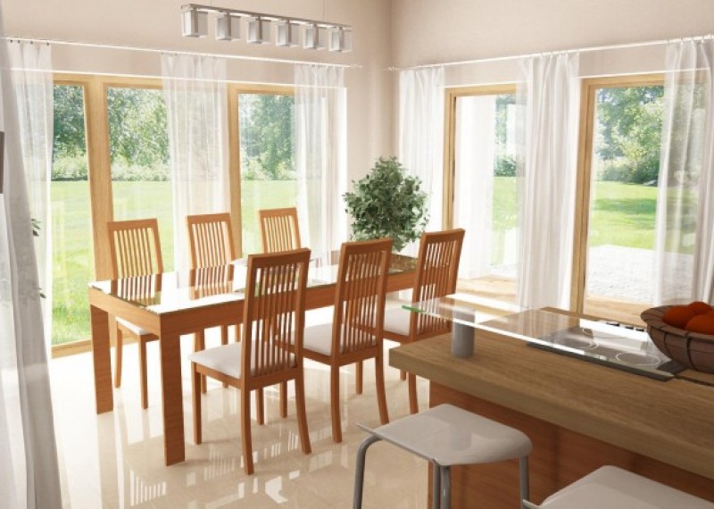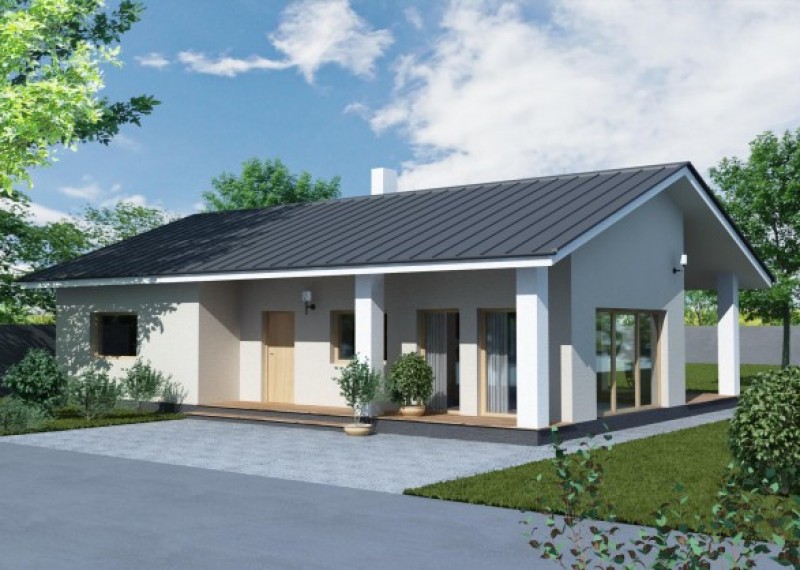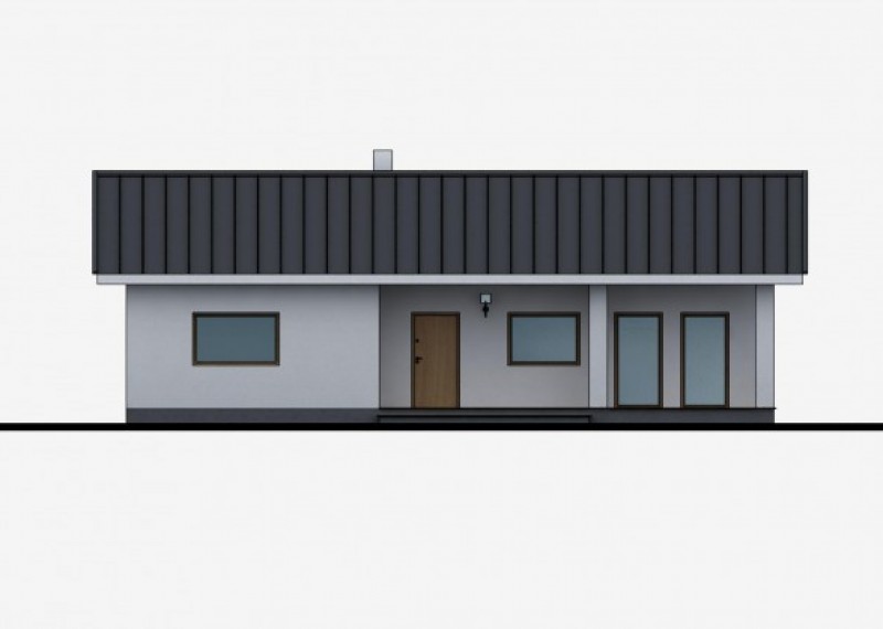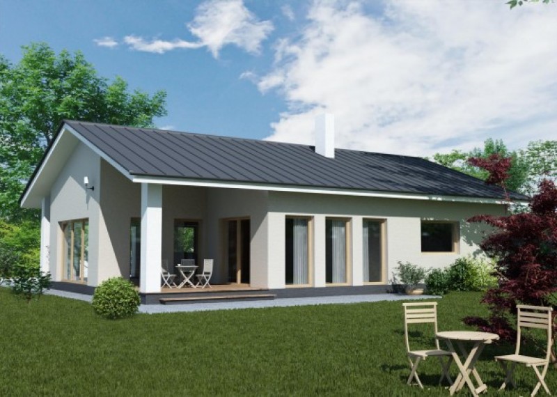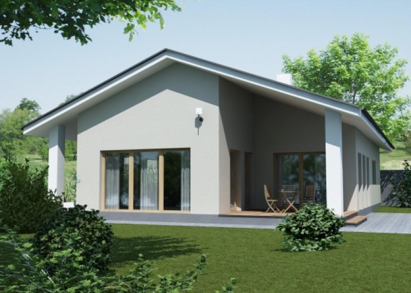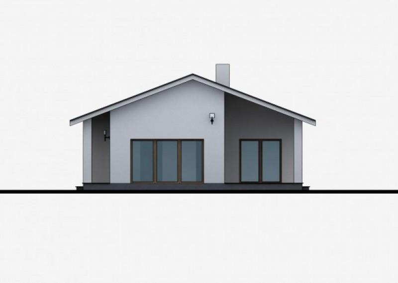 Jednoduchý, kompaktní bungalov se sedlovou střechou a bohatým prosklením. Dům je ideální pro pohodlné bydlení 4členné rodiny. Zajímavým a zároveň praktickým prvkem je přesah střechy, chránící terasu a vstup do domu.