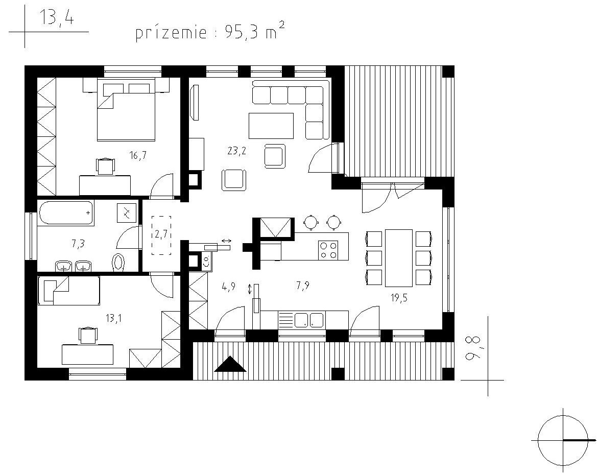 Denní část tvoří kuchyň s jídelnou a nadstandardně velký obývací pokoj s krbem. Celý prostor společenské části domu prosvětlují velká francouzská okna, která zárověň interiér propojují s krytou terasou a zahradou.