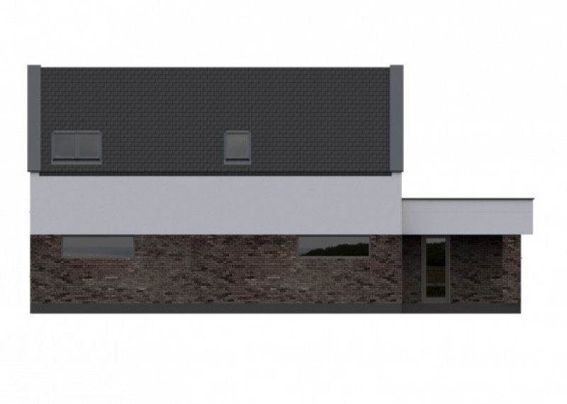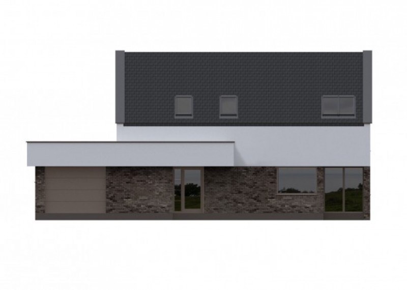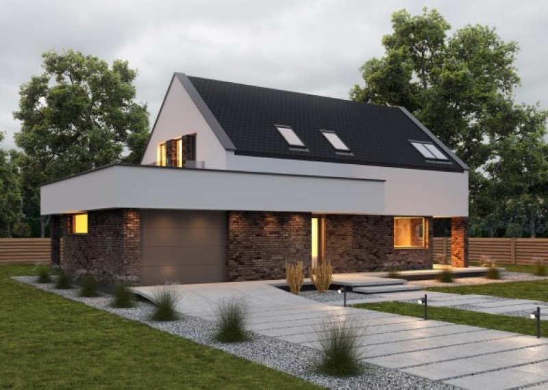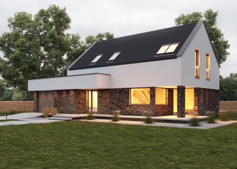 Moderní, 5pokojový rodinný dům se sedlovou střechou a obytným podkrovím. Cihlový obklad na části fasády dodává domu neotřelý vzhled.