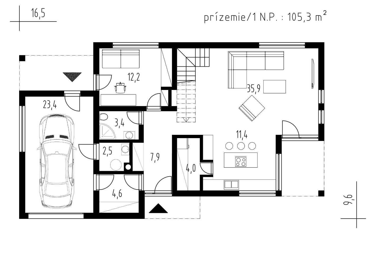V přízemí se nachází obytný velkoprostor s krbem, propojený s jídelnou a kuchyňským koutem, kde je navržen varný ostrůvek s barovým sezením. Nechybí ani prostorná spíž. Bohaté prosklení je zárukou dokonalého prosvětlení interiéru a ničím nerušeného výhledu do zahrady.