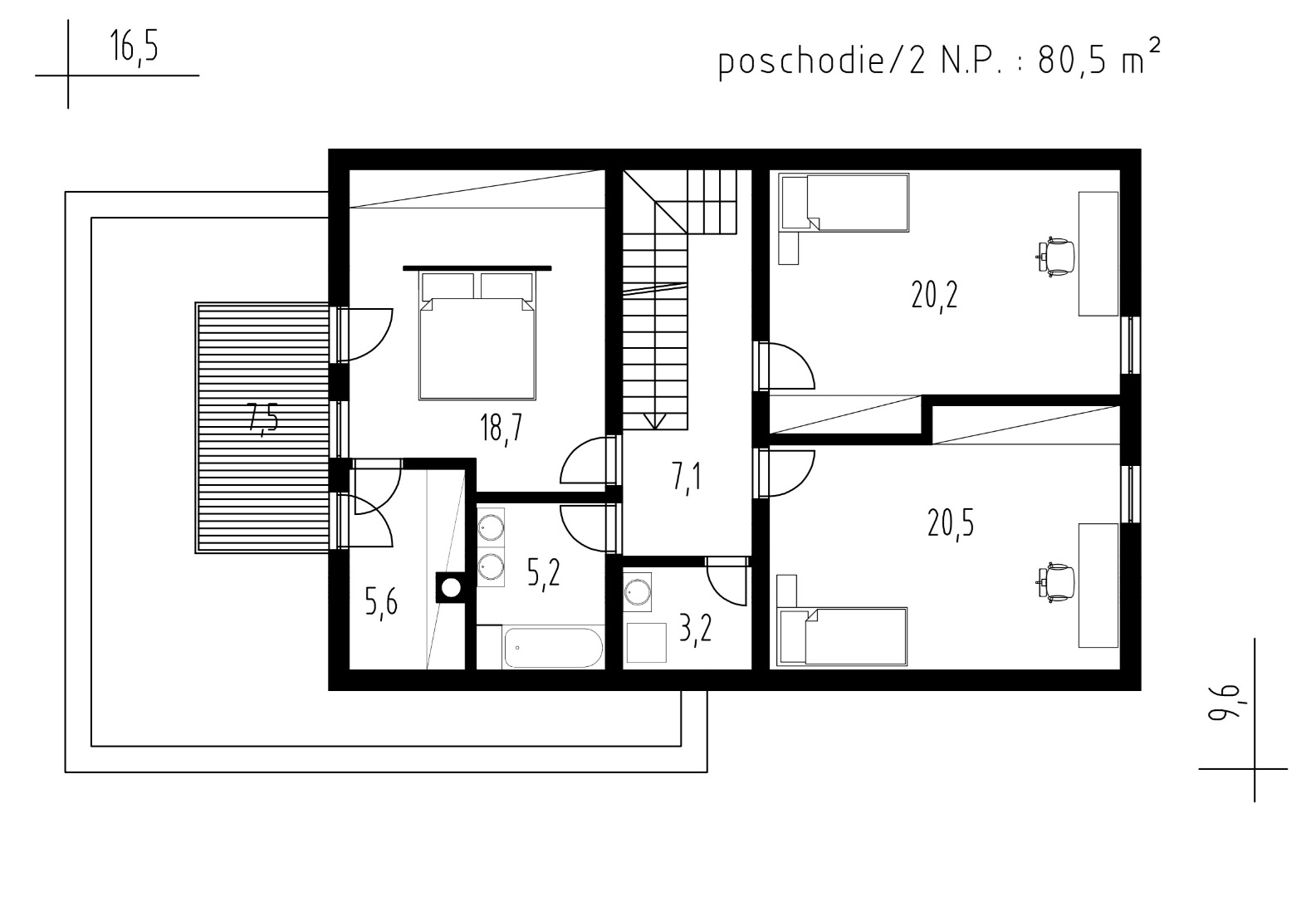 V podkroví je navržena ložnice rodičů s vlastní šatnou a výstupem na terasu. Dále koupelna s vanou, komora a 2 dětské pokoje.