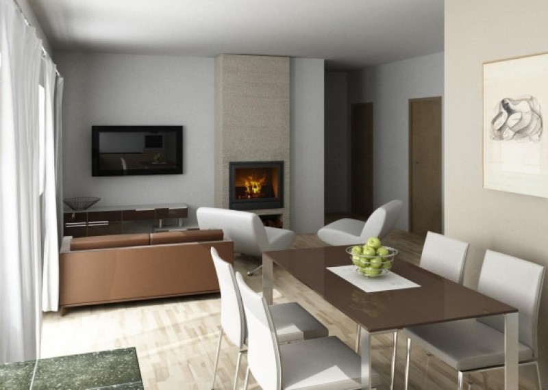 Srdcem domu je velký obytný prostor, propojený s jídelnou a kuchyňským koutem. Pro zútulnění atmosféry nechybí ani krb. Francouzské okno v obývací části zajišťuje přirozené propojení pokoje s terasou a ničím nerušený výhled do zahrady.