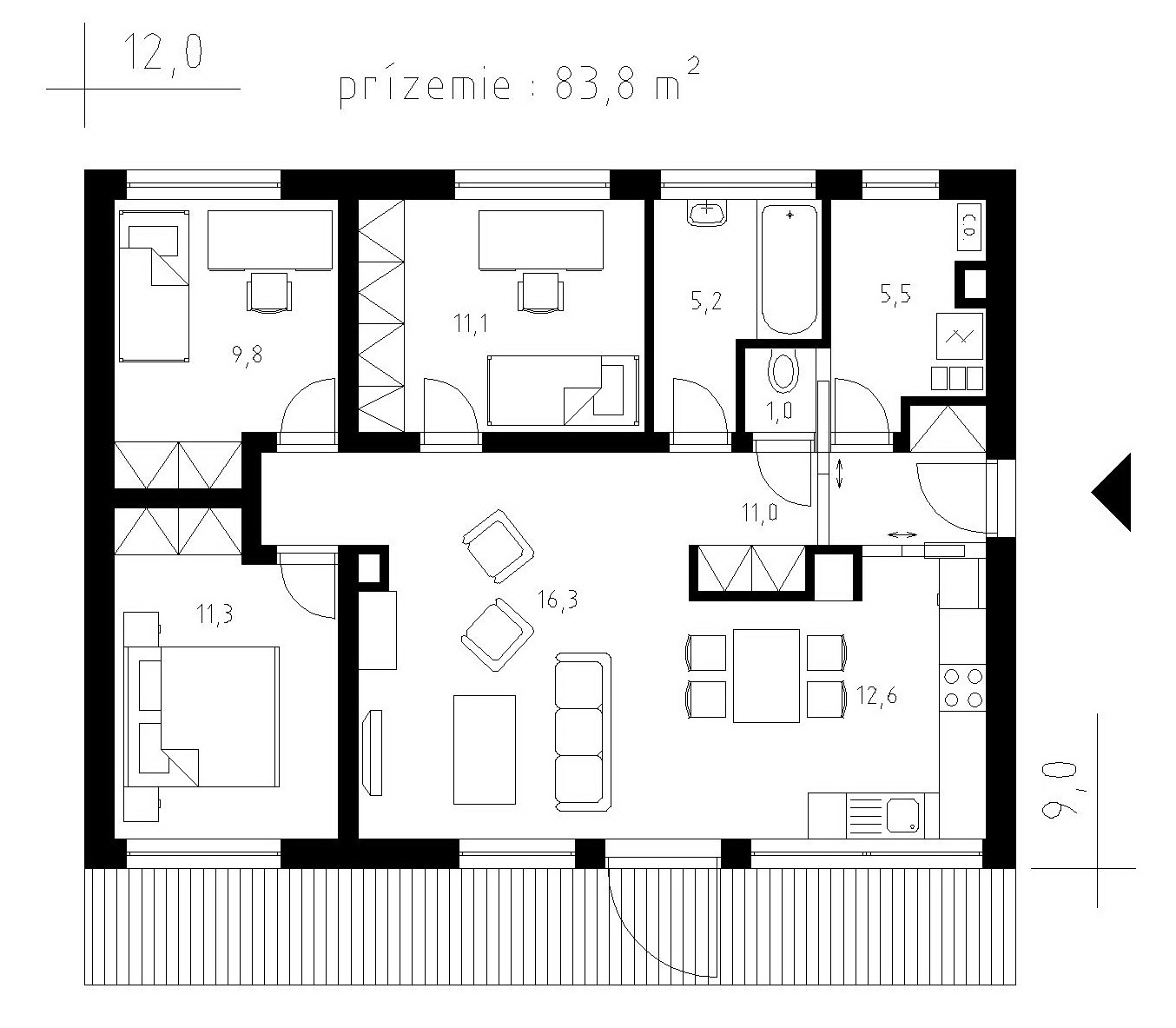 V každém z pokojů je navržen dostatečný prostor pro instalaci vestavěných skříní.