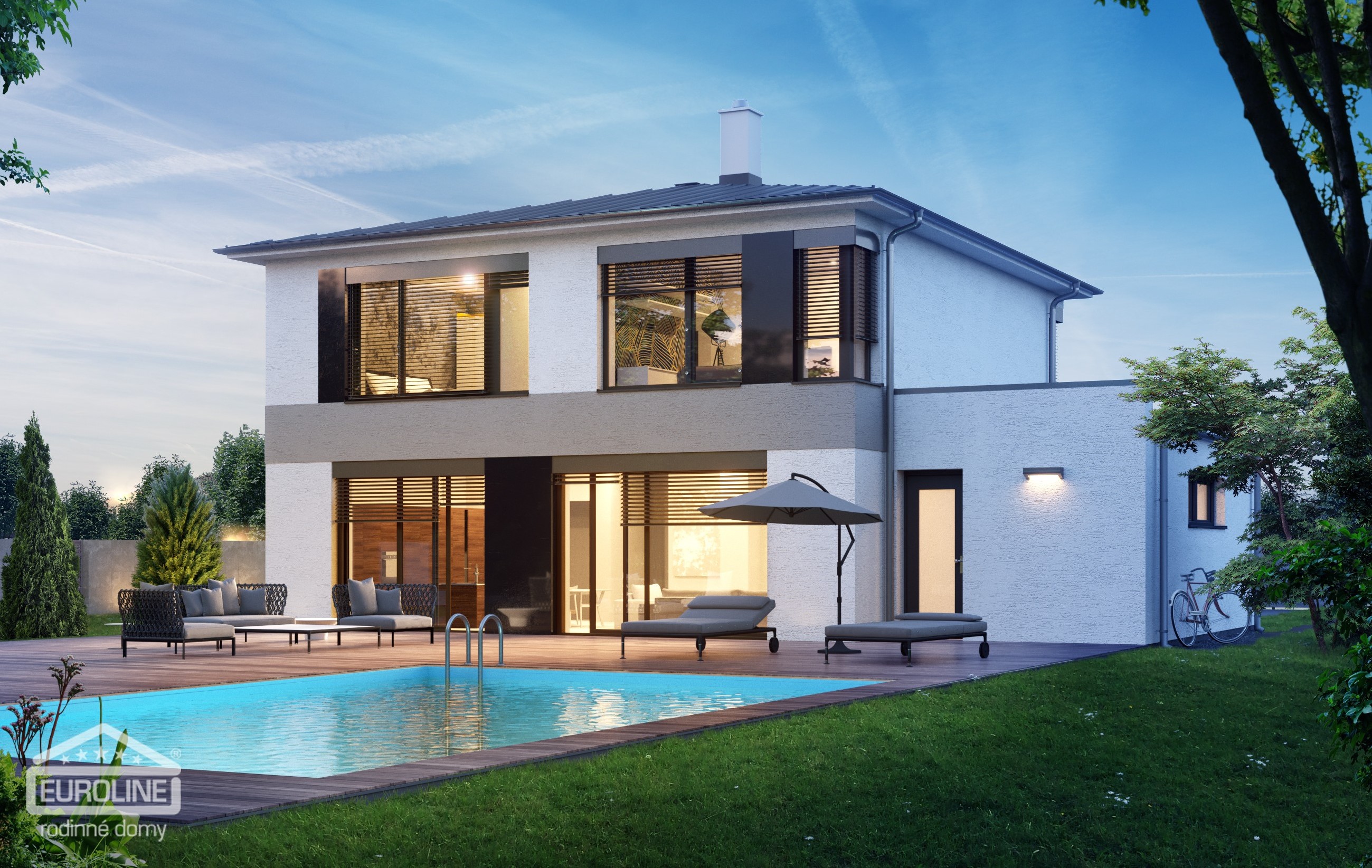 Cena včetně DPH. Orientační cena domu na klíč vypočtená na základě průměrných cen při optimalizovaném standardu použitých materiálů a technologií v poměru cena/výkon. Cena obsahuje základovou desku. Cena neobsahuje terasu, krbovou vložku, žaluzie, systém řízeného větrání s rekuperací, kuchyňskou linku ani žádný jiný nábytek, oplocení pozemku, zpevněné plochy na pozemku, sadové úpravy.