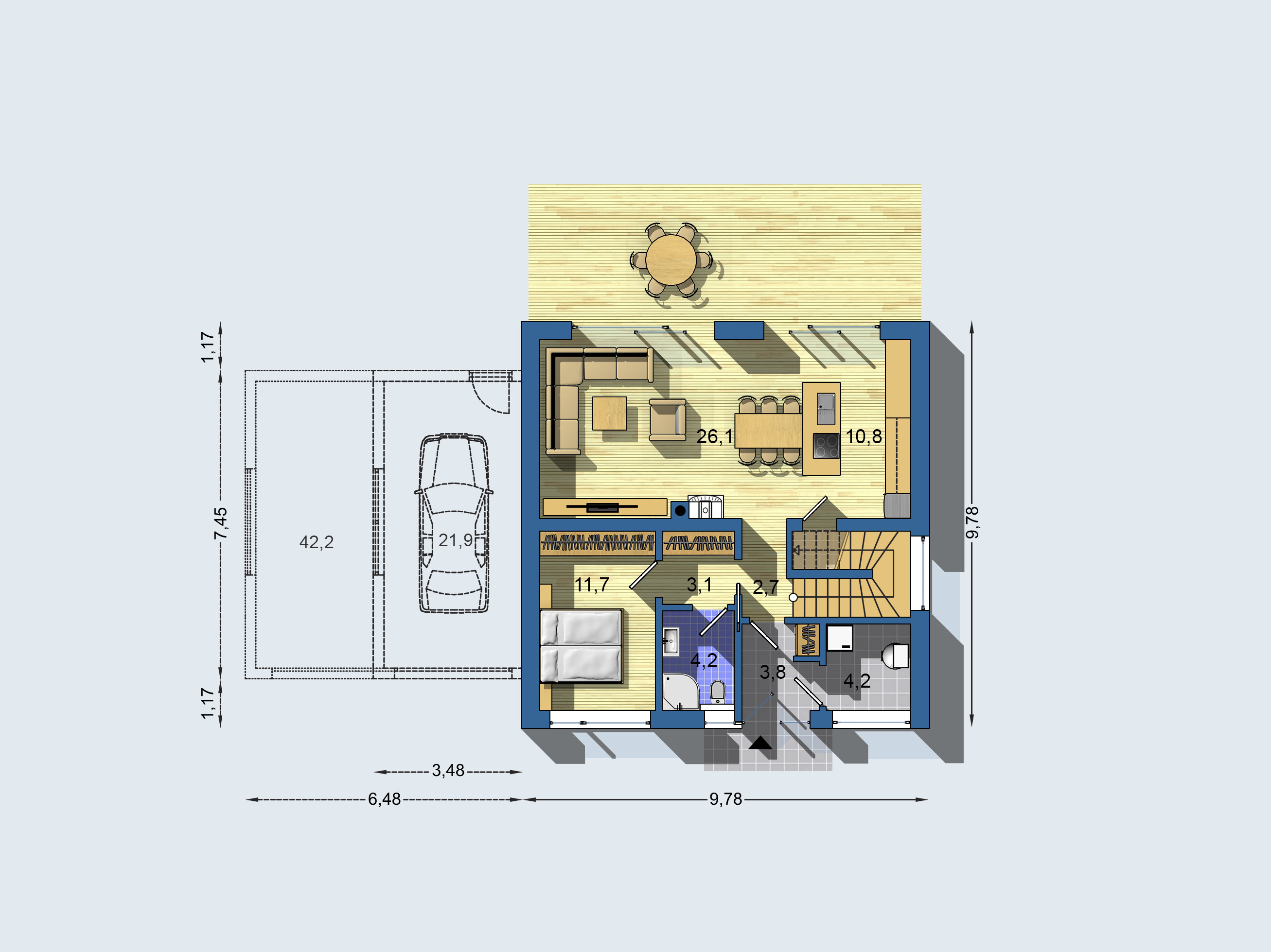 Praktický dvoupodlažní rodinný dům s plnohodnotným podlažím s rovným podhledem a efektivně využitým půdorysem. Dům je vhodný pro pohodlné bydlení větší rodiny se 2 až 3 dětmi.