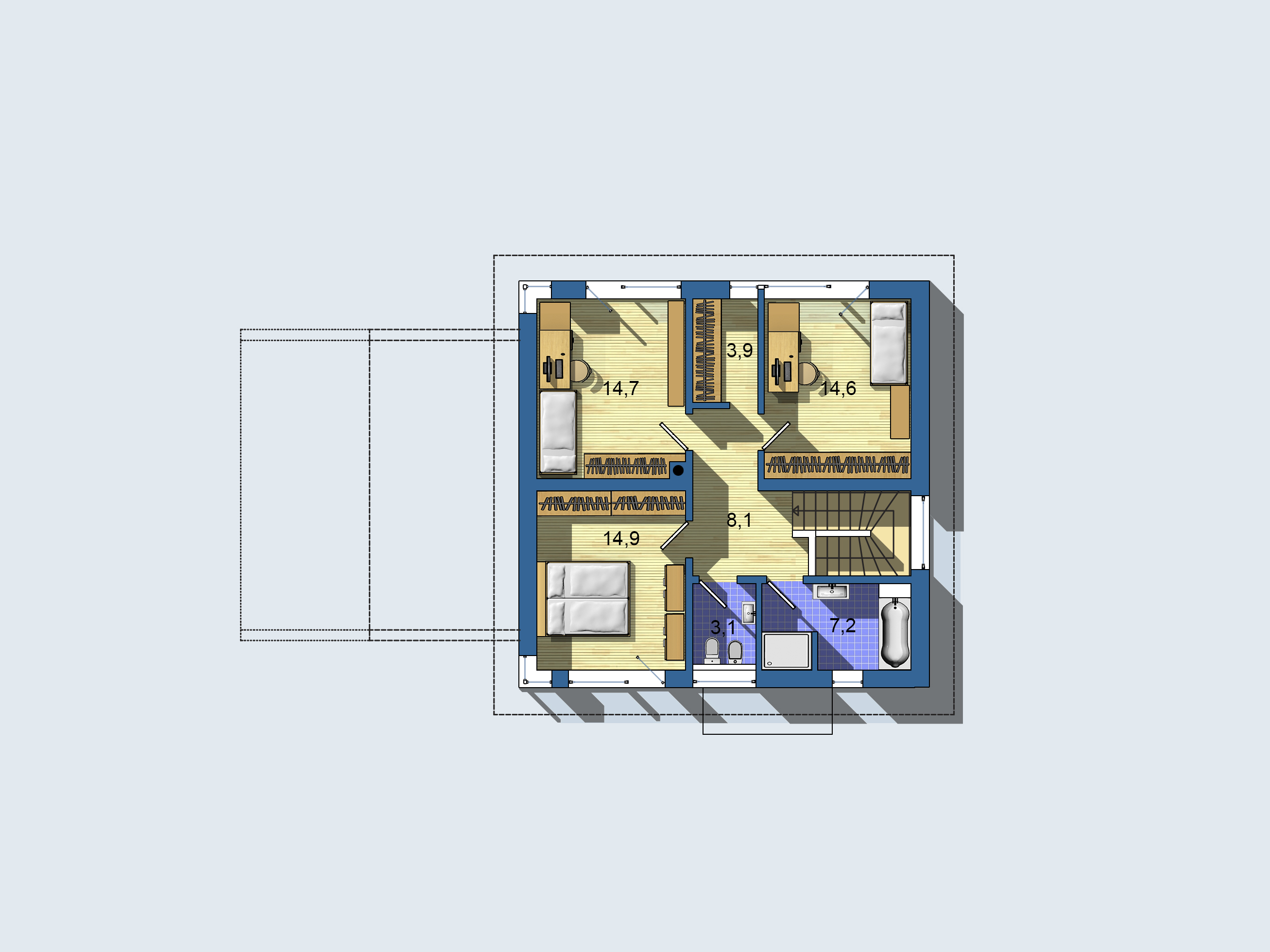 V patře jsou navrženy 3 prostorné ložnice s velkými okny a dostatkem místa pro instalaci vestavěných skříní. Dále samostatná šatna, WC a koupelna s vanou i sprchovým koutem.