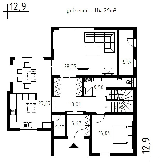 V přízemí se nachází velkorysý obývací prostor s krbem, propojený ale zároveň opticky oddělený od kuchyně s jídelnou. Součástí kuchyně je praktická spíž. Bohaté prosklení je zárukou dokonalého prosvětlení interiéru denním světlem a jeho přirozeného propojení s terasou a zahradou.