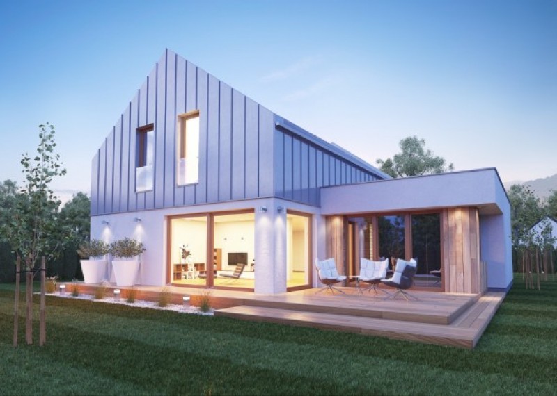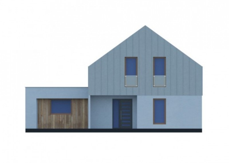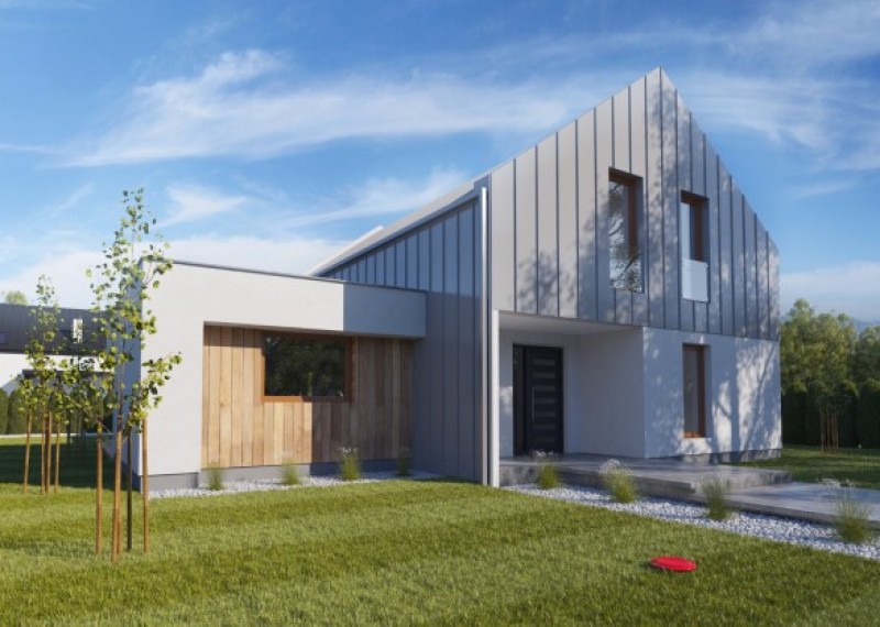 Moderní, originální rodinný dům se sedlovou střechou a obytným podkrovím. Charakteristickým prvkem domu jsou 2 hmoty - jedna s plochou a druhá se sedlovou střechou, originalitu domu podtrhuje falcovaný plech použitý na střeše i na části fasády.