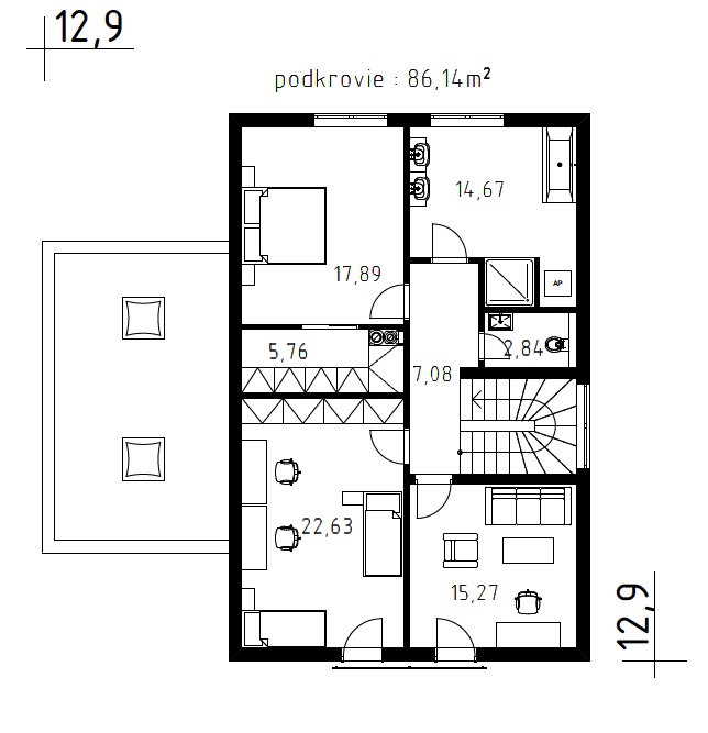 V podkroví najdeme nadstandardně velkou koupelnu s vanou i sprchovým koutem, samostatné WC a 3 pohodlné ložnice. Ložnice rodičů má vlastní šatník.
