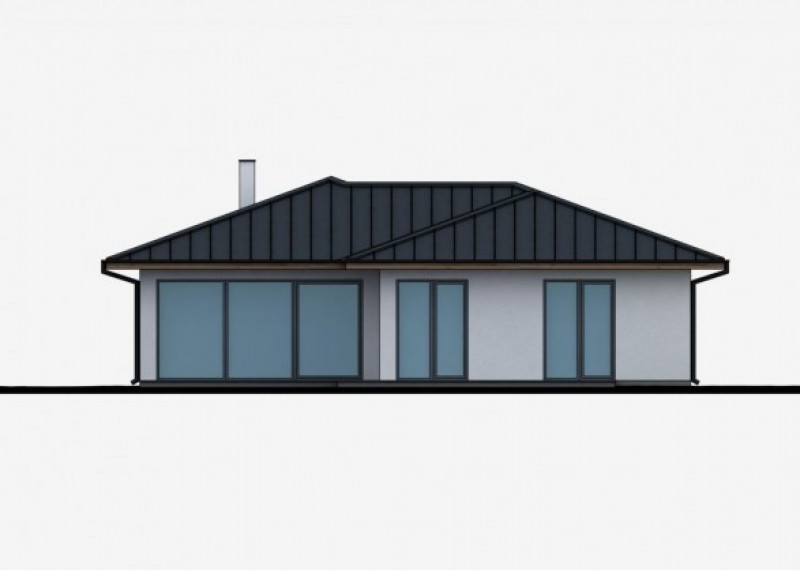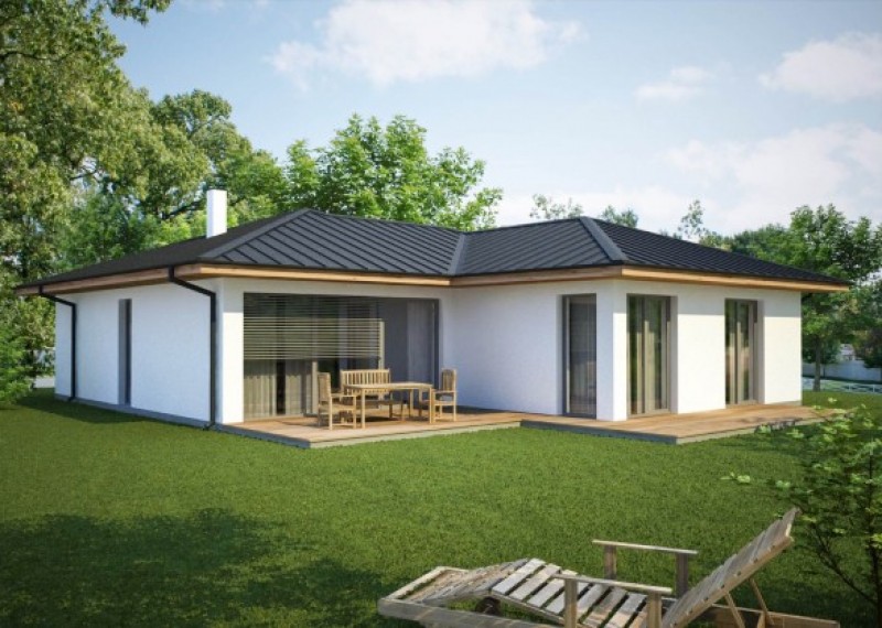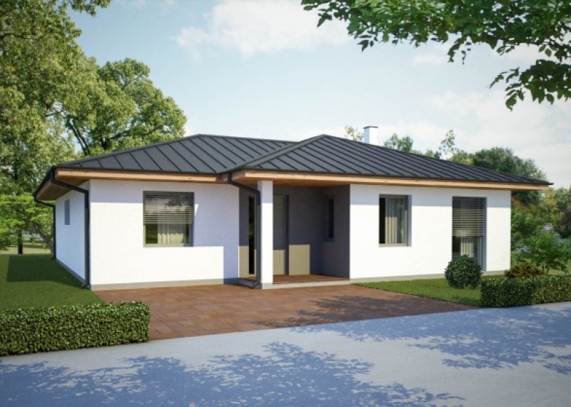 Praktický bungalov na půdorysu ve tvaru L, což zaručuje dostatečné soukromí na terase a výstup na ni ze společenské části i dětských pokojů. Dům je ideální pro pohodlné bydlení 4-5členné rodiny.
