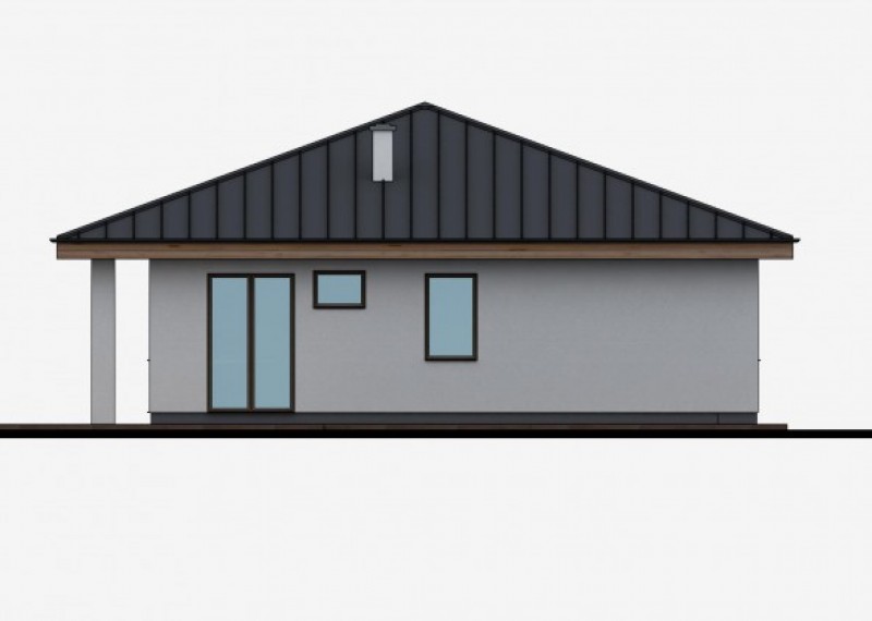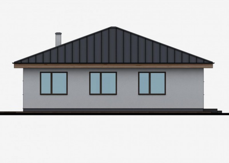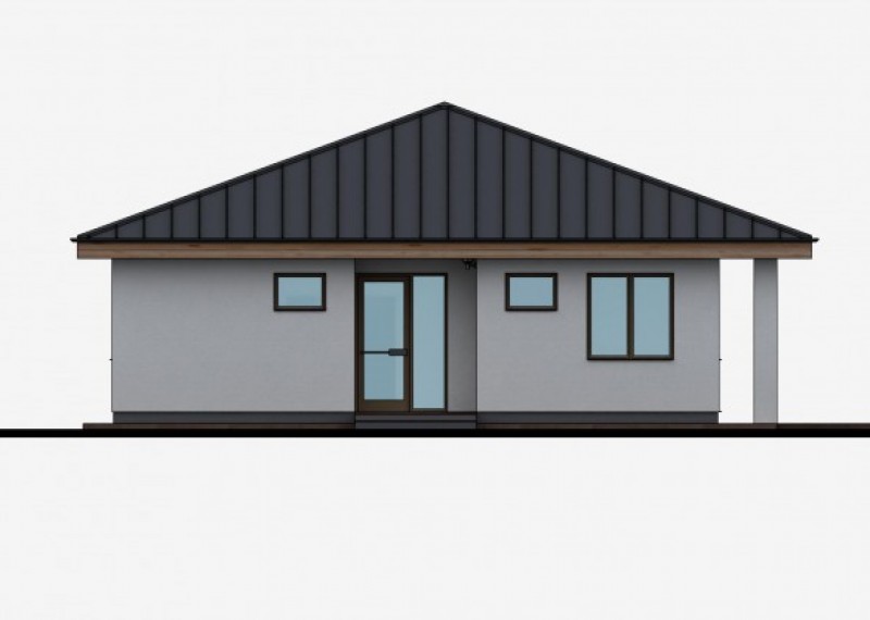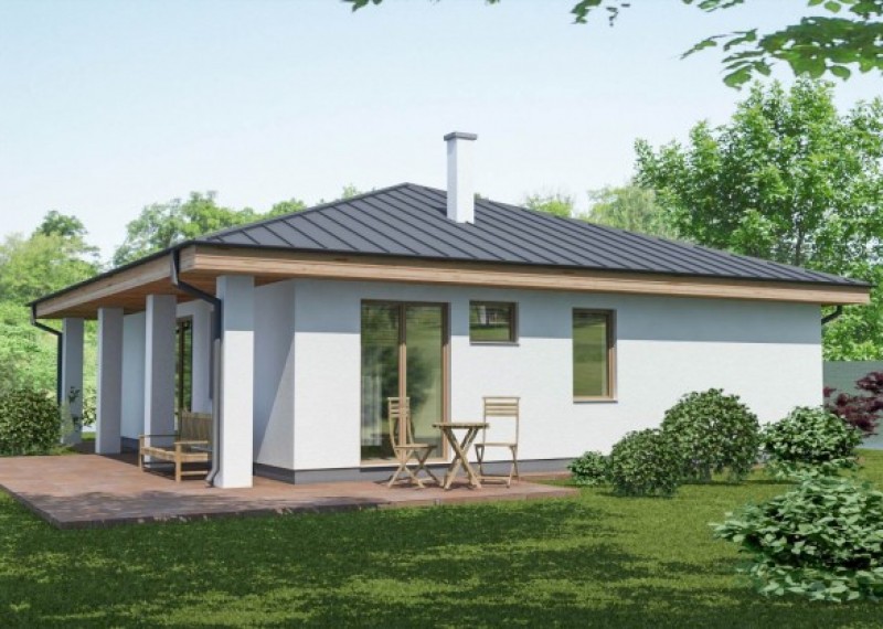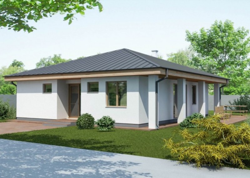 Jednoduchý, kompaktní rodinný dům typu bungalov klasického vzhledu. Dům je ideální pro pohodlné bydlení 4-5členné rodiny. Charakteristickým prvkem domu je terasa, krytá přesahem střechy.