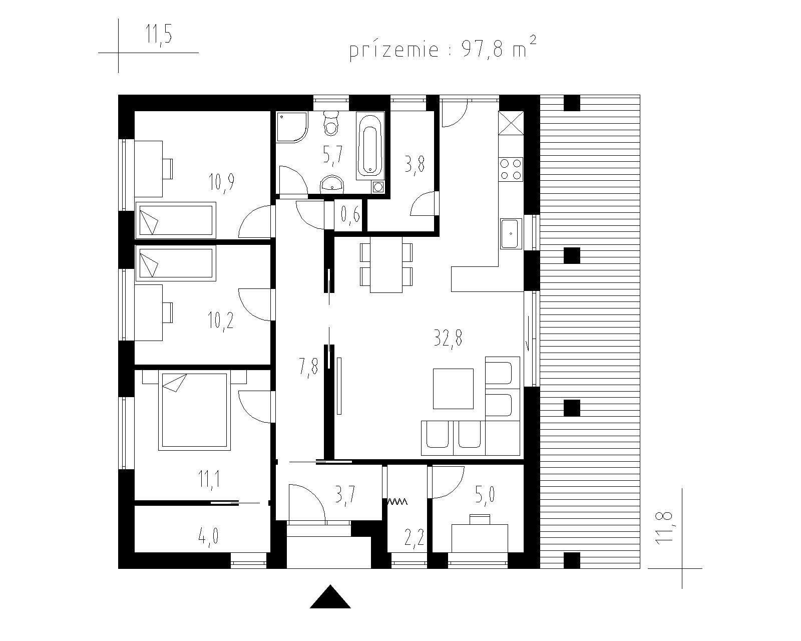 Srdcem domu je obývací prostor, propojený s jídelnou a kuchyňským koutem. Praktickým prvkem kuchyně je spíž pro pohodlné skladování potravin.