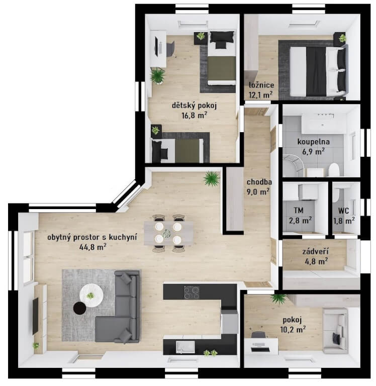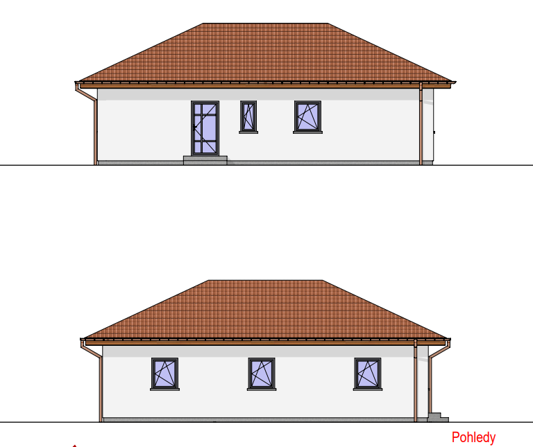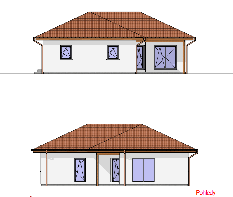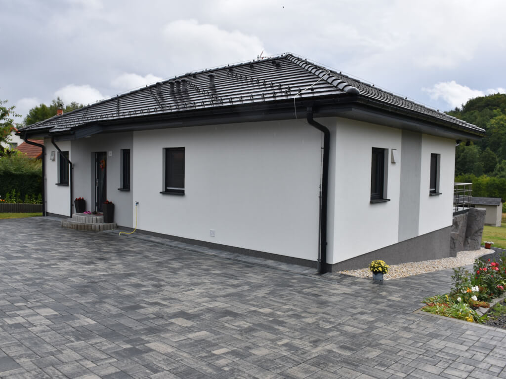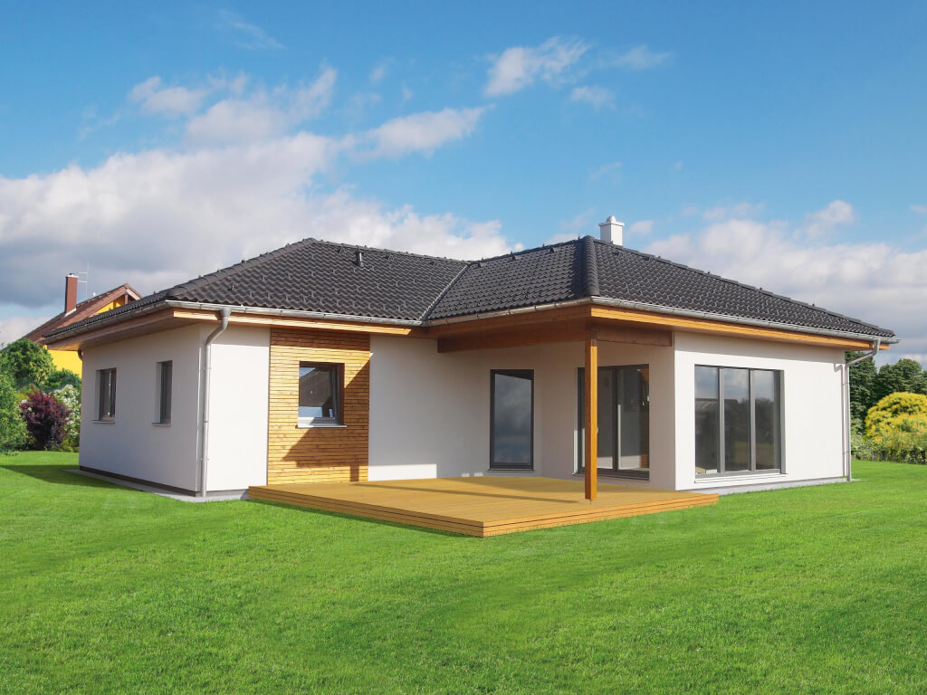 Praktický bungalov s půdorysem ve tvaru L, což zajišťuje dokonalý pocit soukromí na terase. Dům je ideální pro pohodlný život 4-5členné rodiny. Praktickým prvkem domu je terasa krytá přesahem střechy.