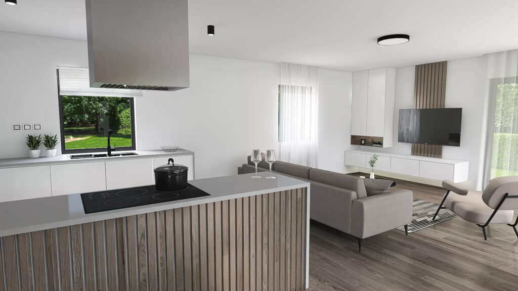 Společenskou část domu tvoří obytný velkoprostor, propojený s jídelnou a kuchyňským koutem. Velká plocha francouzských oken zajišťuje dostatečné prosvětlení interiéru a jeho přirozené propojení s terasou.