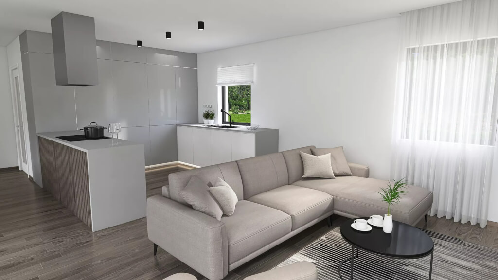 Dům k dokončení neobsahuje finální povrchy podlah a stěn (obklady, dlažby, podlahové krytiny, výmalba), zařizovací předměty koupelen a wc, interiérové dveře a zárubně.