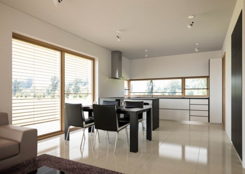 Společenskou část domu tvoří obývací prostor s krbem, jídelnou a kuchyňským koutem. V kuchyni je navržen praktický sklad potravin. Francouzská okna ve všech pokojích dostatečně prosvětlují interiér a umožňují výstup na terasu.