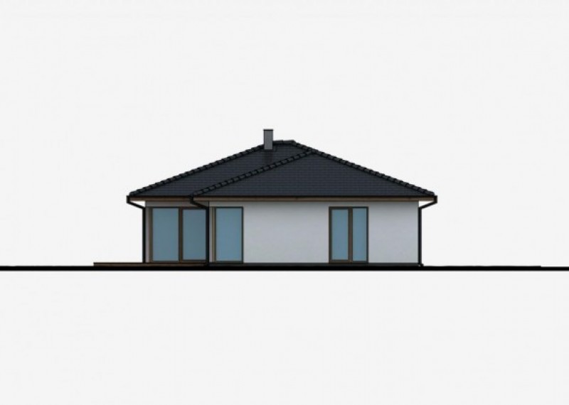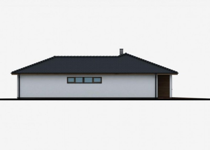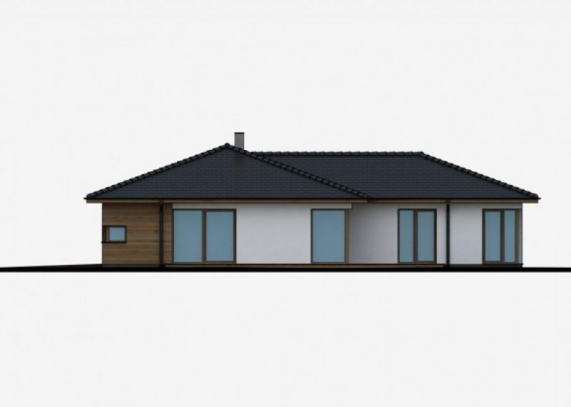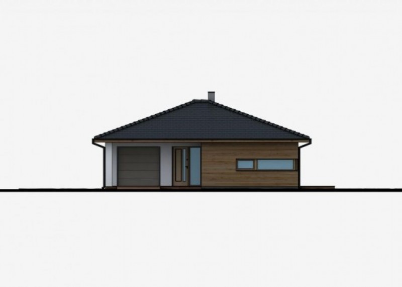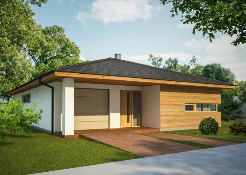 Praktický rodinný dům typu bungalov s garáží. Dřevěný obklad na části fasády dodává domu atraktivní vzhled.