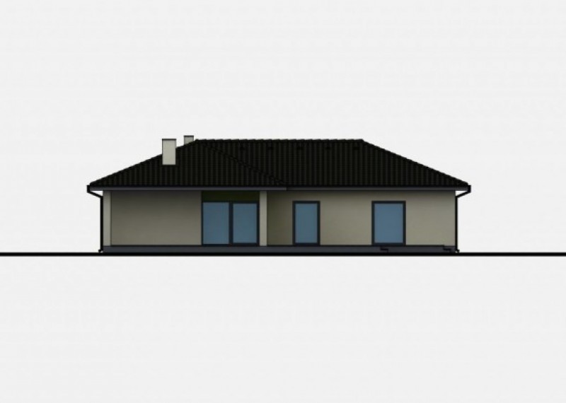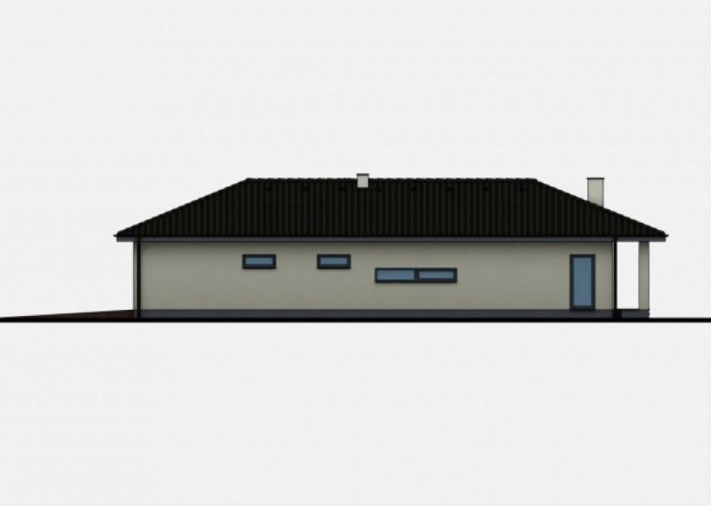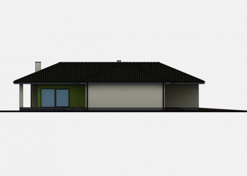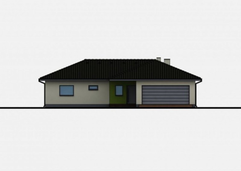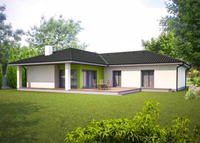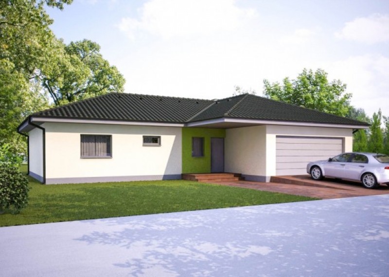 Komfortní rodinný dům typu bungalov s garáží pro 2 auta. Půdorys ve tvaru L zajišťuje dokonalé soukromí na terase. Vstup do domu i část terasy jsou chráněny přesahem střechy.