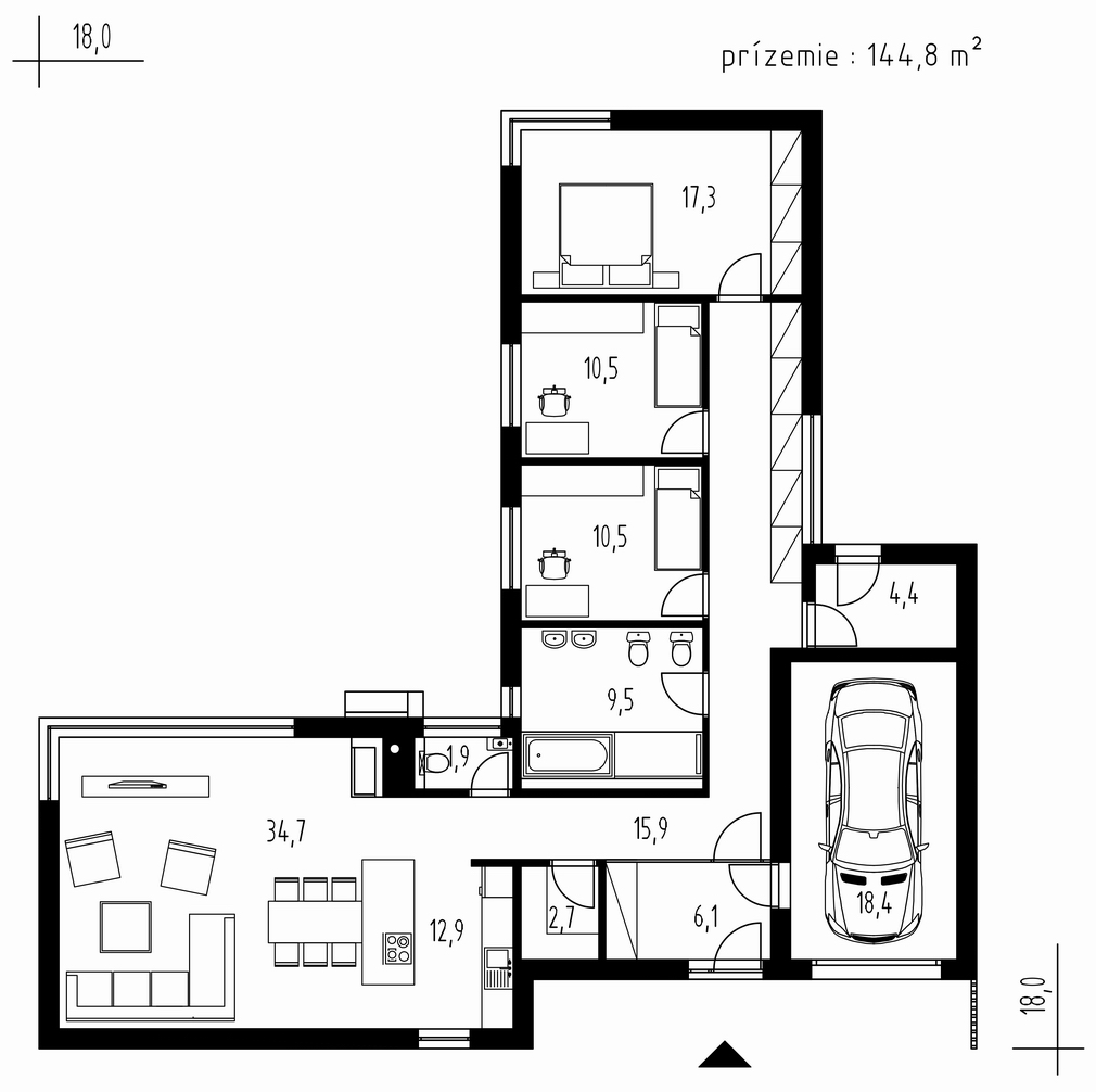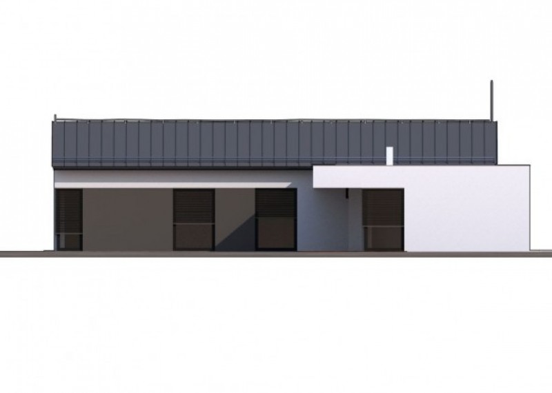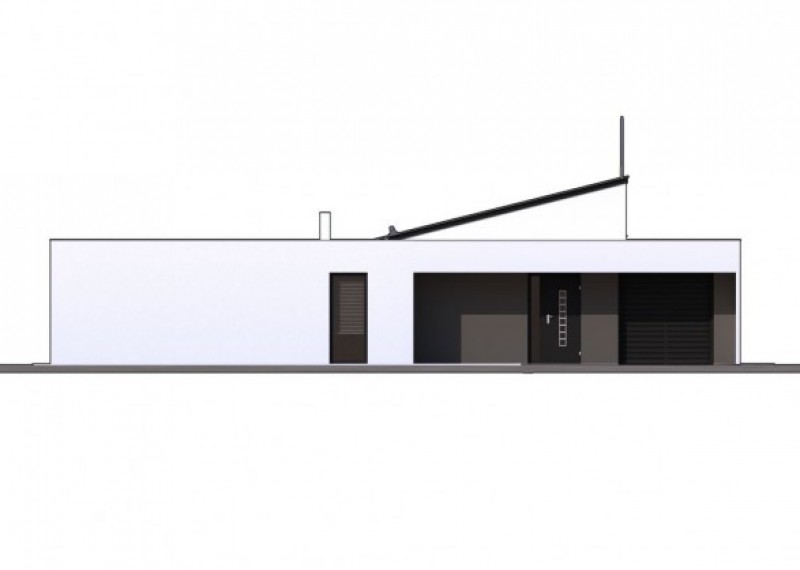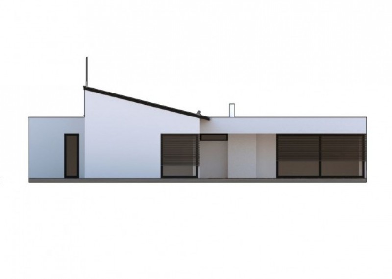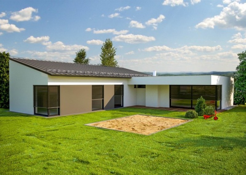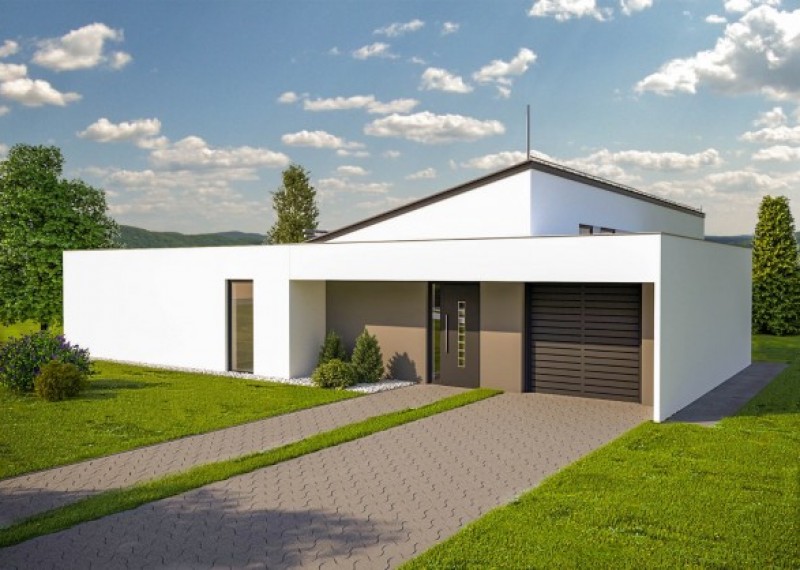 Moderní, přízemní dům s garáží a s kombinací rovné a pultové střechy. Dům je ideální pro pohodlné bydlení 4-5členné rodiny. Půdorys domu ve tvaru L zaručuje dostatek soukromí na terase a výstup do zahrady ze všech obytných místností.