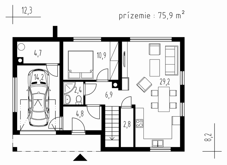 V přízemí se nachází obývací prostor s krbem, propojený s jídelnou a kuchyňským koutem. Praktická spíž slouží k pohodlnému skladování potravin. Bohaté prosklení zajišťuje kromě dostatku denního světla v interiéru také přirozené propojení s terasou a ničím nerušený výhled do zahrady.