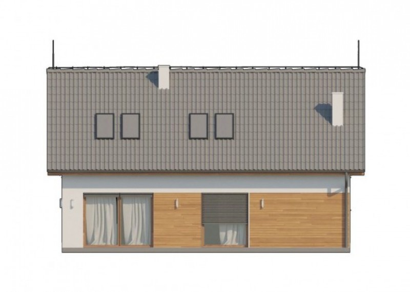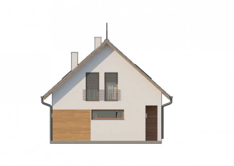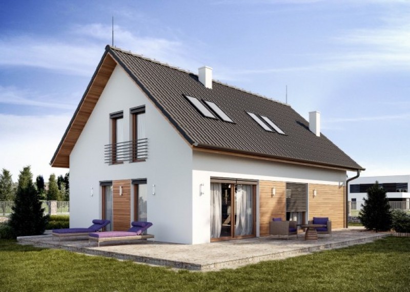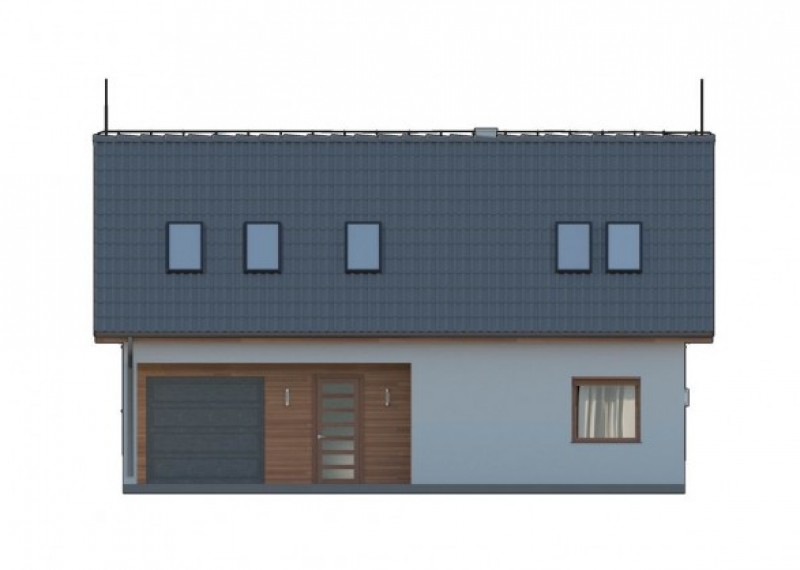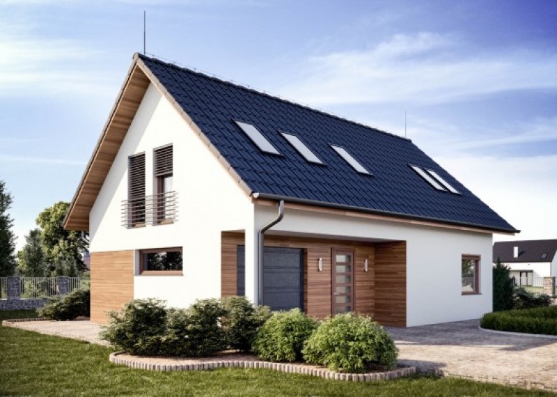 Jednoduchý, komfortní rodinný dům se sedlovou střechou a obytným podkrovím, určený pro velkou rodinu. Součástí domu je garáž s technickou místností. Použití dřevěného obkladu na části fasády dodává domu svěží vzhled.