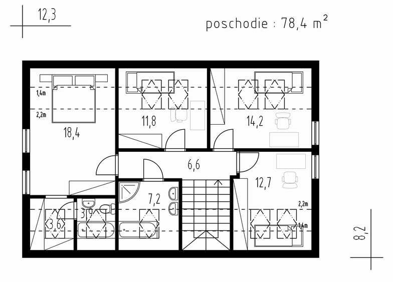 V podkroví jsou navrženy 4 pohodlné ložnice, přičemž ložnice rodičů má vlastní šatnu a koupelnu s vanou. Další koupelna s vanou i sprchovým koutem je společná pro zbývající 3 pokoje.