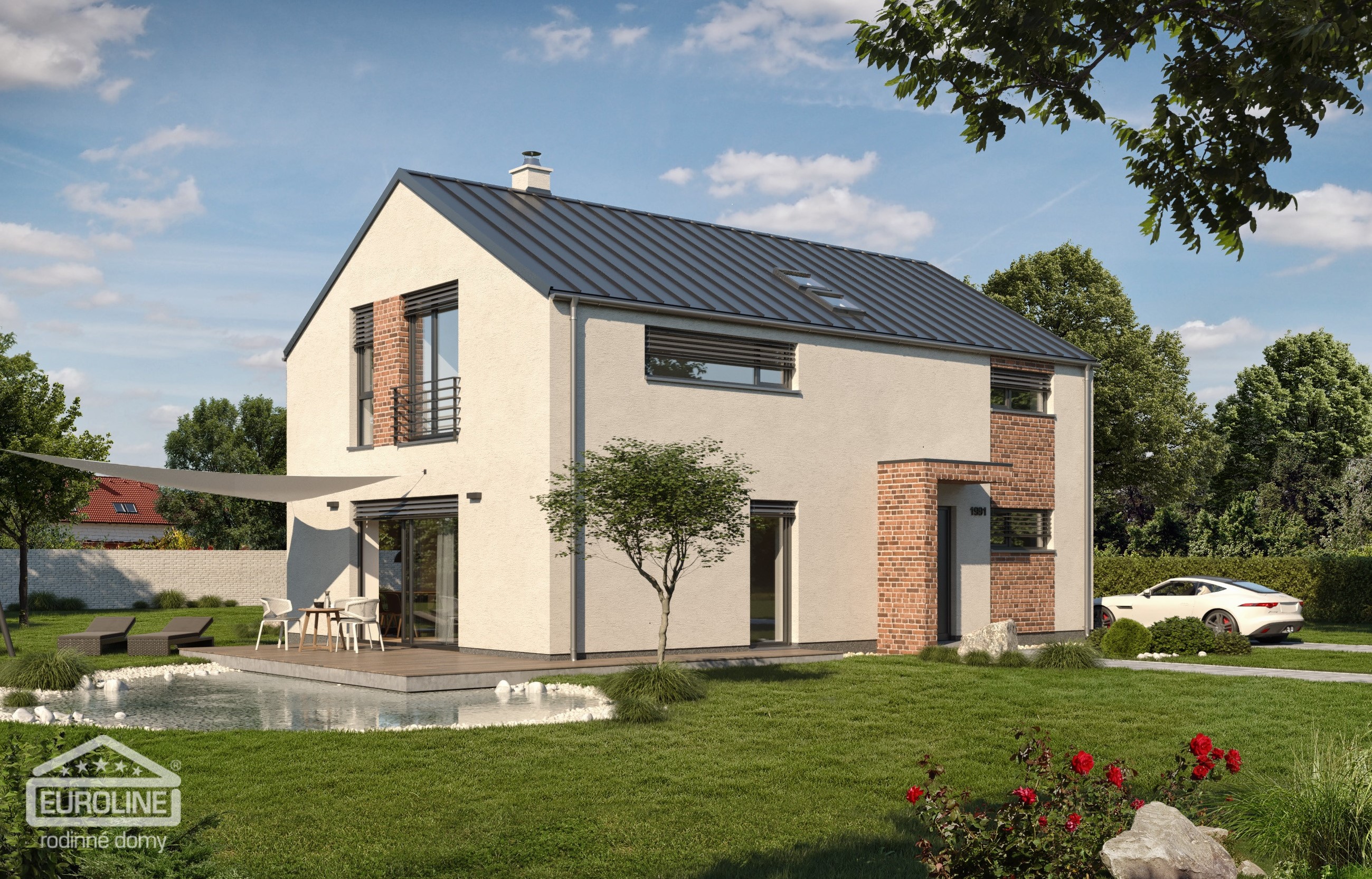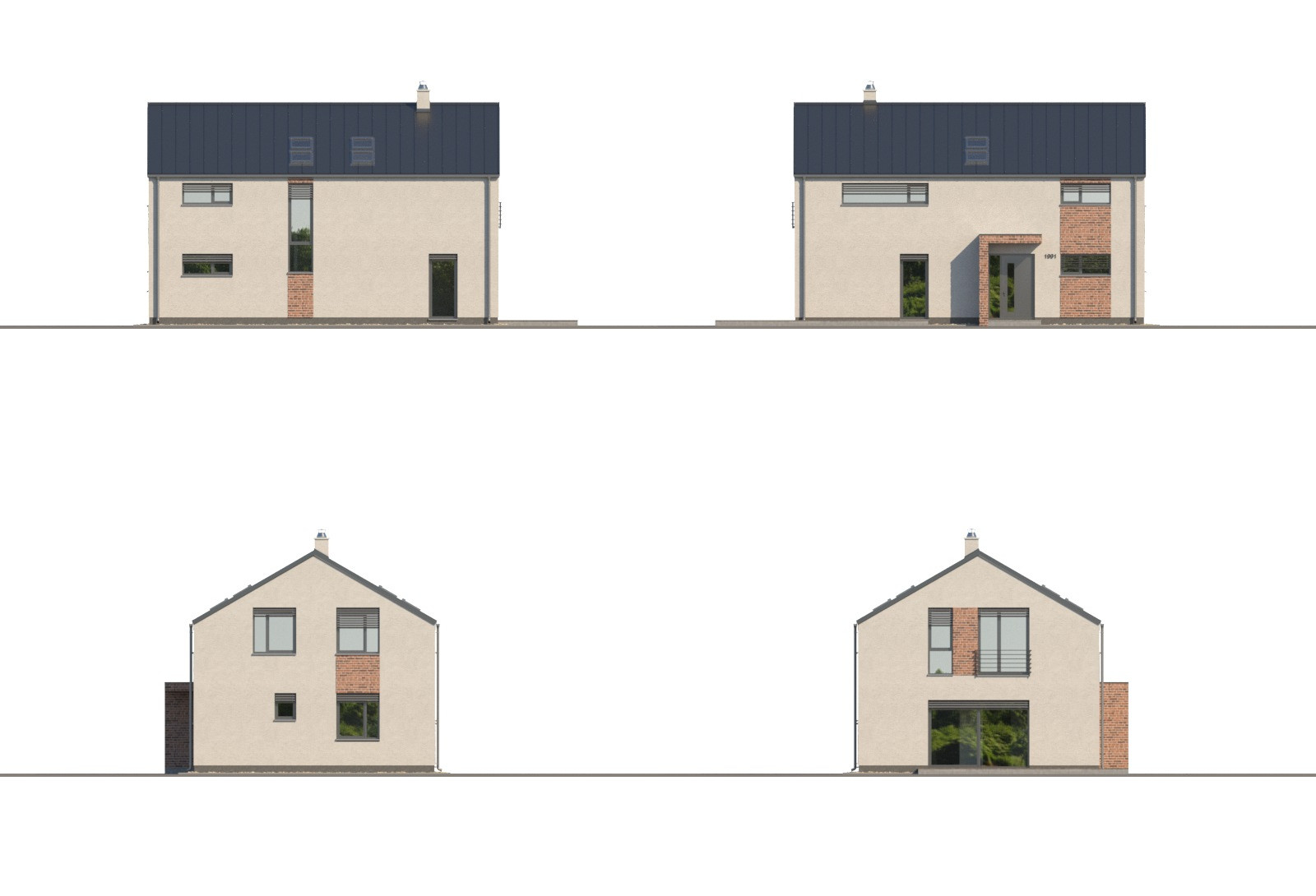 Moderní dvoupodlažní rodinný dům, vhodný pro 4-5člennou rodinu, je možné umístit i na menší parcelu. Zajímavými architektonickými prvky jsou částečné obložení fasády cihlovým obkladem, střešní krytina z falcovaného plechu nebo překrytí vstupu.