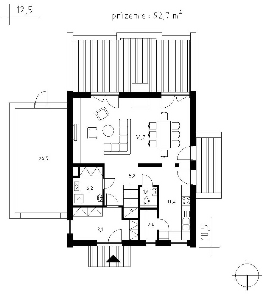 V přízemí se nachází společenská část domu, tvořená otevřeným velkoprostorem s obývací částí, jídelnou a opticky odděleným kuchyňským koutem. Velké prosklené plochy interiér dokonale prosvětlují a jsou zárukou ničím nerušeného výhledu do zahrady. V kuchyni najdeme praktický sklad potravin.