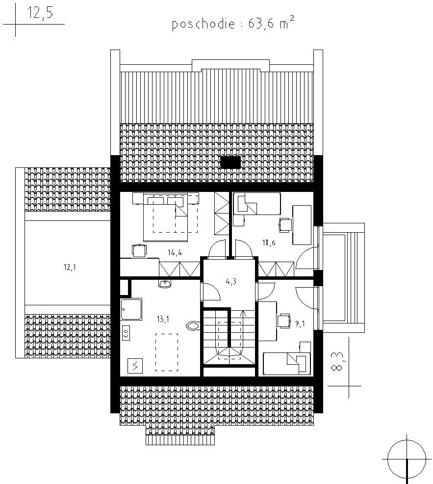 V podkroví jsou umístěny 2 dětské pokoje s výstupem na balkón, ložnice rodičů a prostorná koupelna.