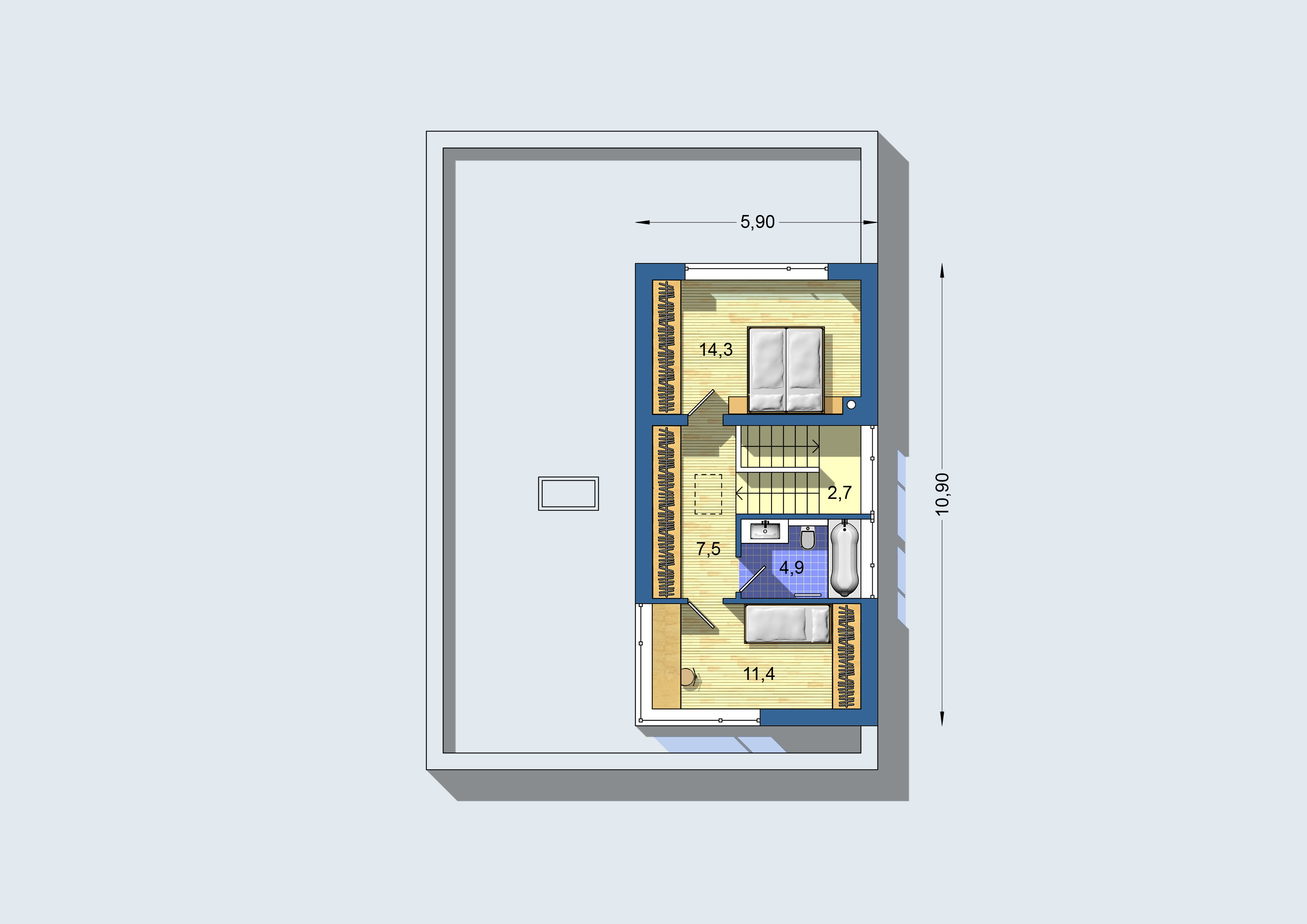 V patře jsou umístěny 2 ložnice a koupelna s vanou a toaletou. Na chodbě je navržen velkorysý prostor pro instalaci vestavěných skříní, stejně tomu je i u každého z pokojů.