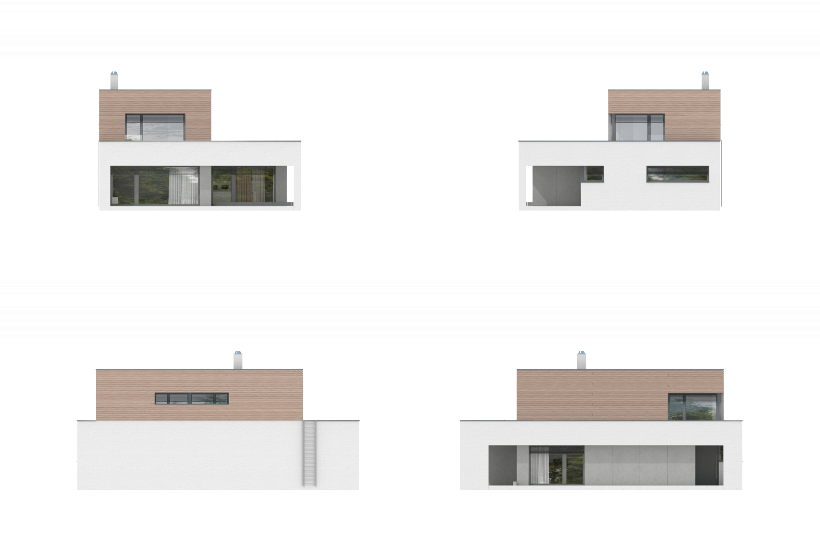 Charakteristickými prvky tohoto rodinného domu jsou překrytí vstupu a terasy přesahem podlaží a optické oddělení ustupující hmoty horního podlaží dřevěným obkladem.