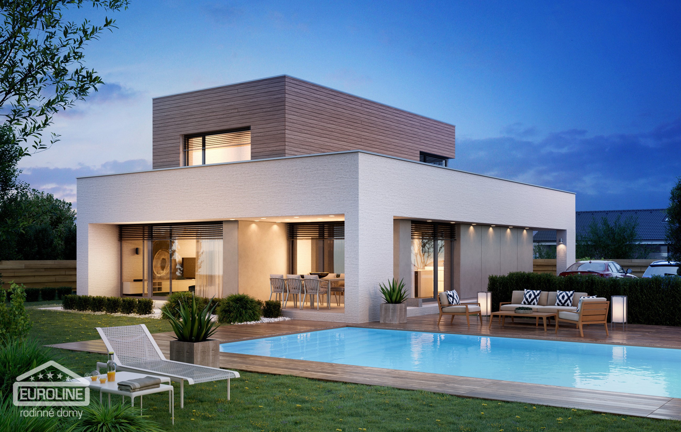 Nadčasová dvoupodlažní vila s plochou střechou a jednoduchými a elegantními liniemi.