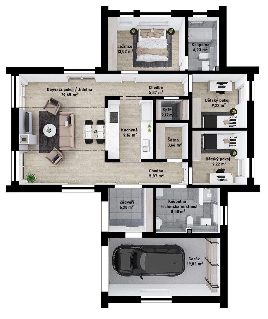 Ve všech pokojích a v zádveří je navržen prostor pro vestavěné skříně.