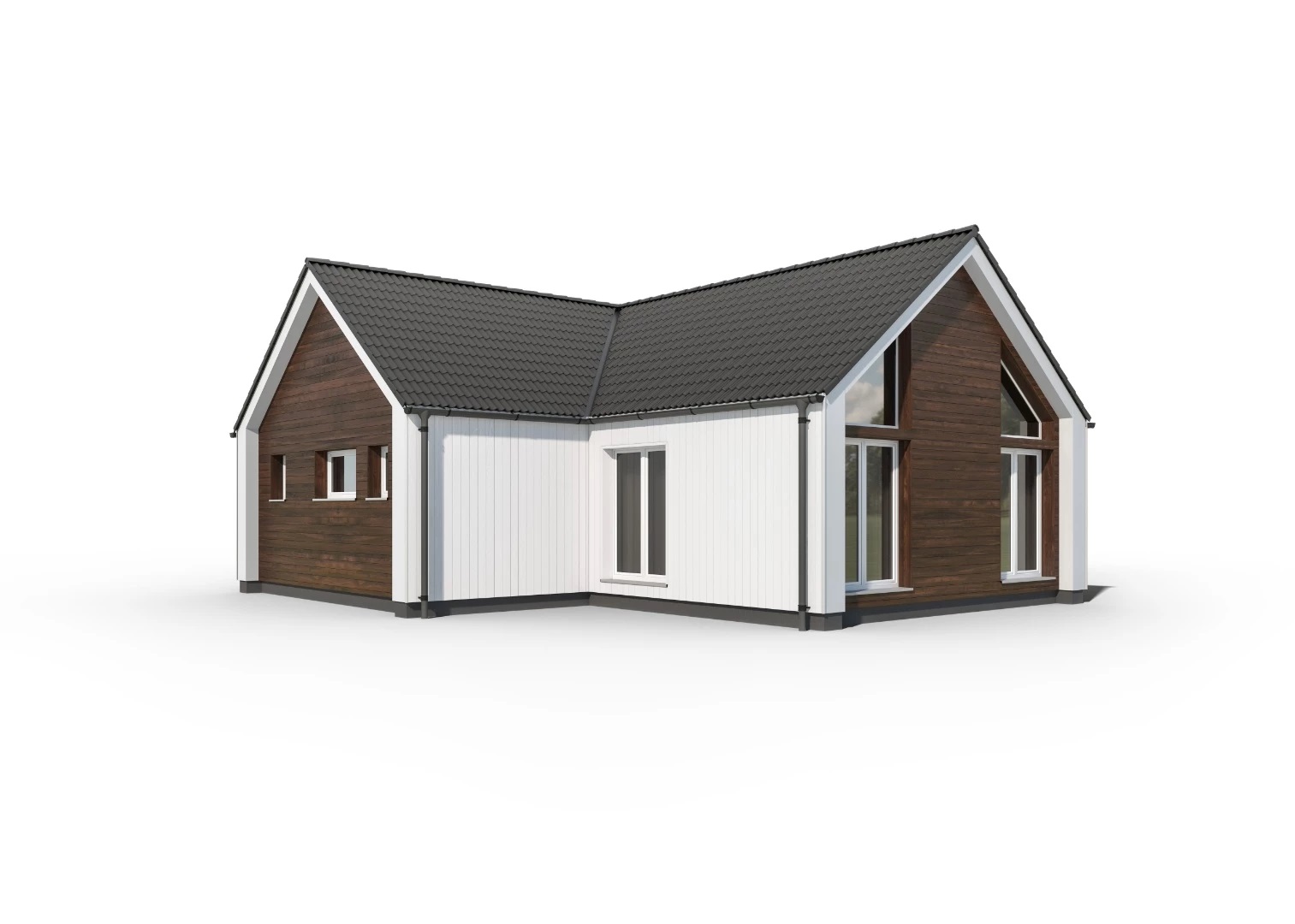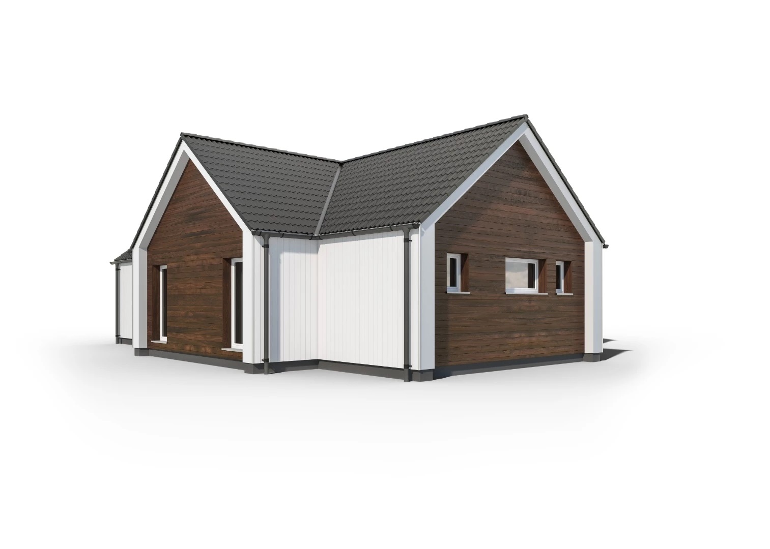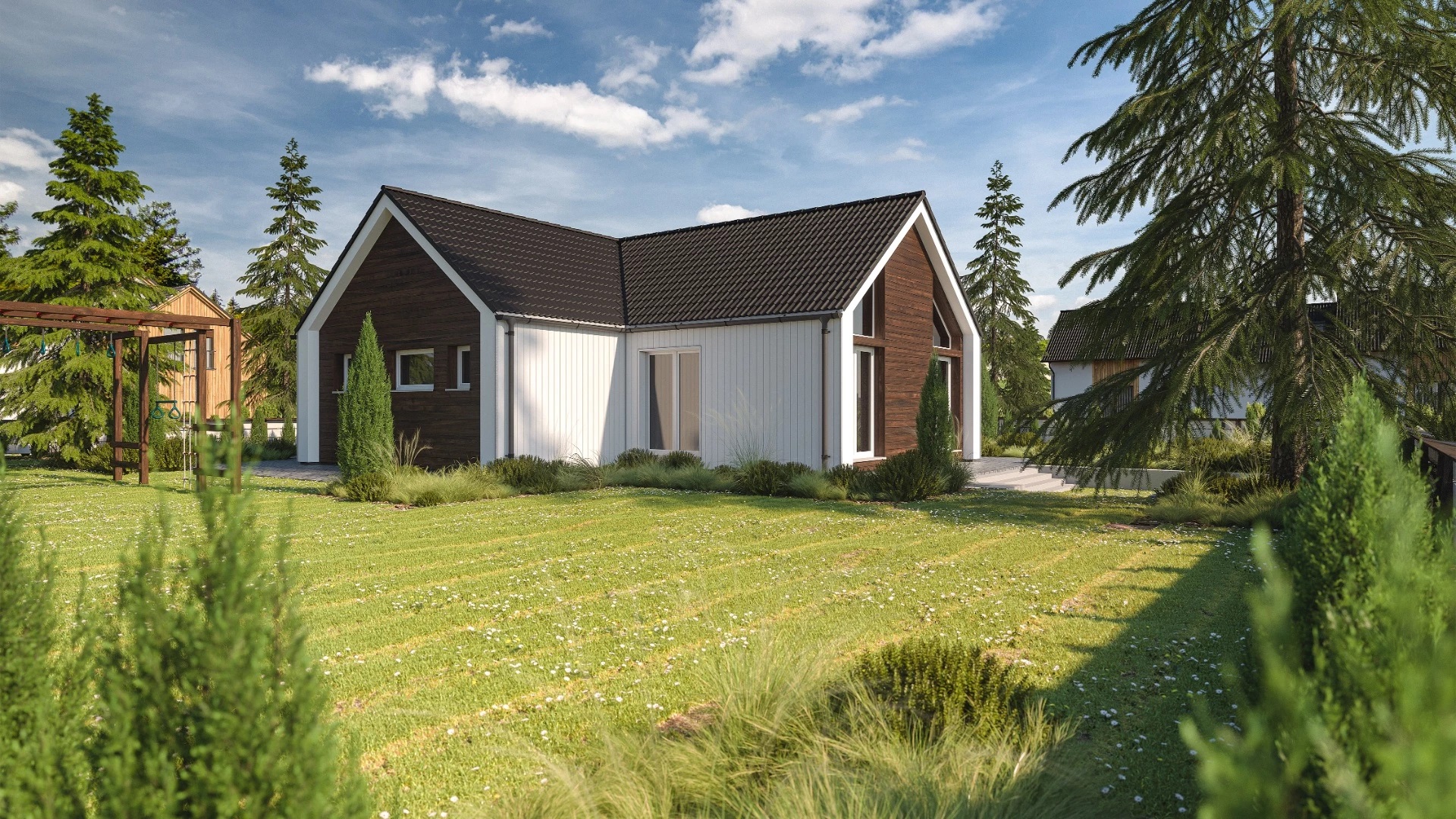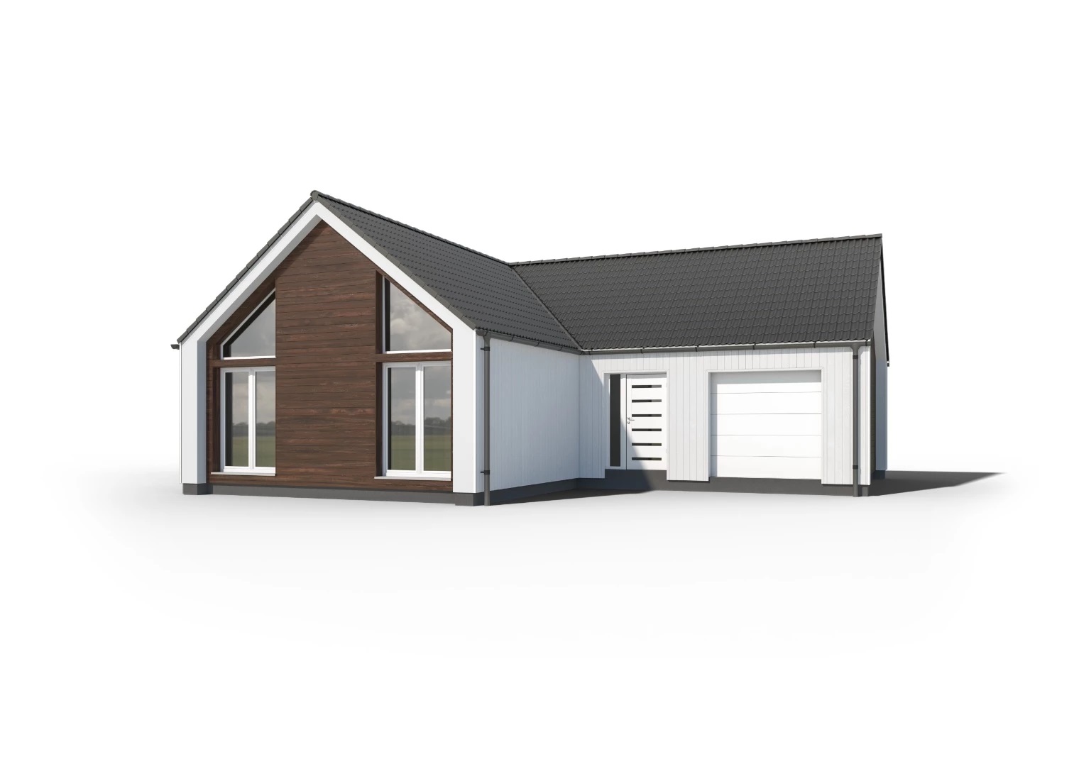Moderní, 4pokojový rodinný dům se sedlovou sřechou ve skandinávském stylu. Součástí domu je garáž. Charakteristickým prvkem jsou velké prosklené plochy a dřevěný obklad, použitý na části fasády.