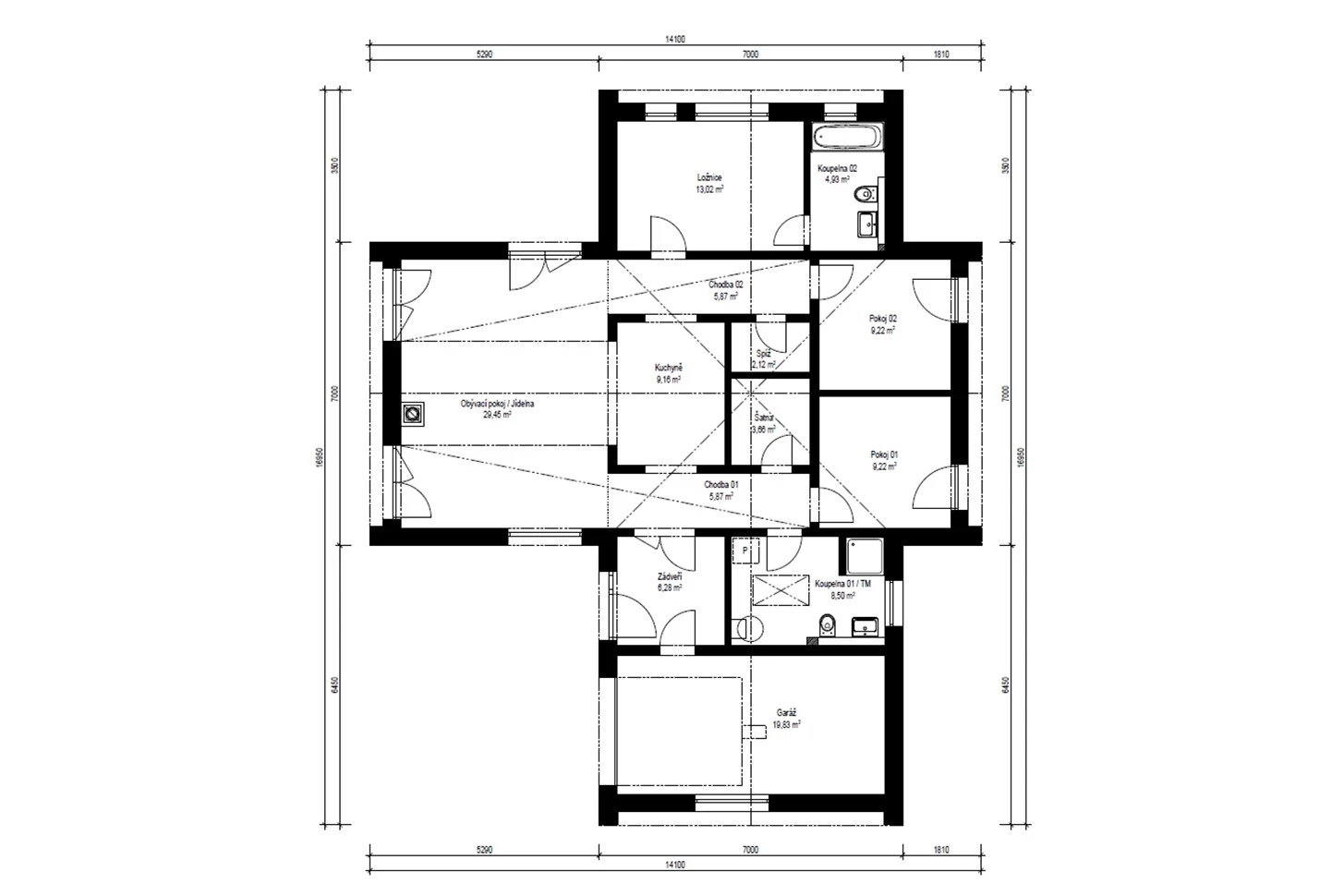 Srdcem domu je obytný velkoprostor s krbem, propojený s jídelnou a kuchyňským koutem. Součástí kuchyně je praktická spíž pro pohodlné skladování potravin. Velké prosklené plochy zajišťují dokonalé prosvětlení interiéru denním světlem a ničím nerušený výhled do zahrady.