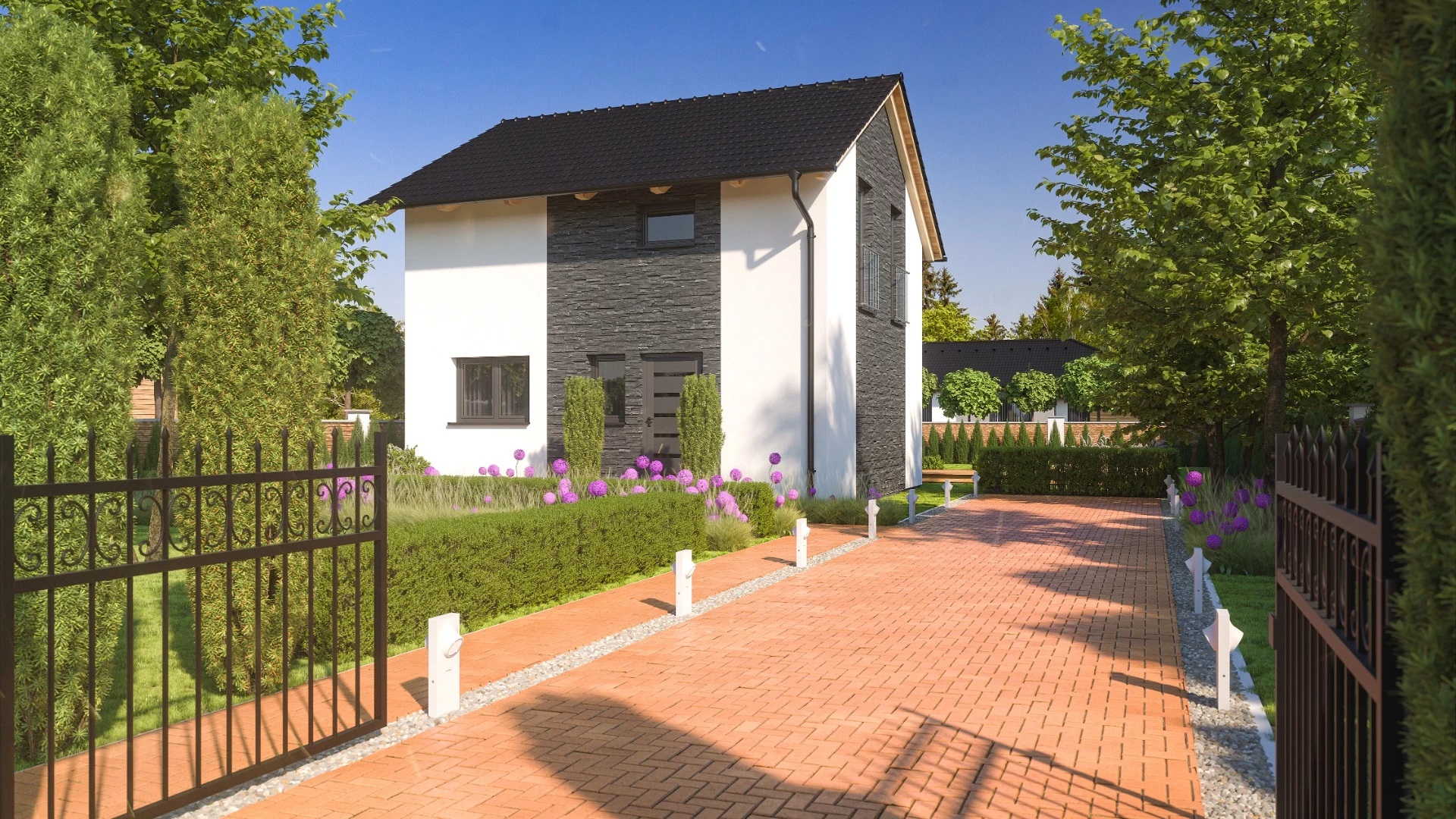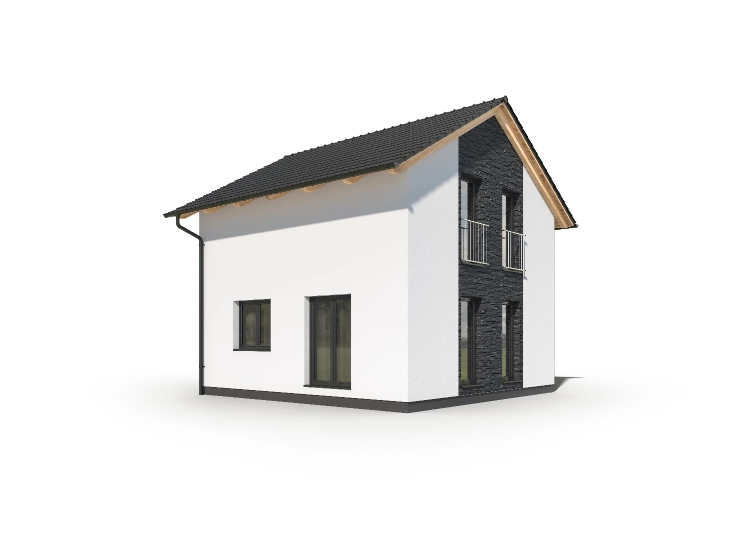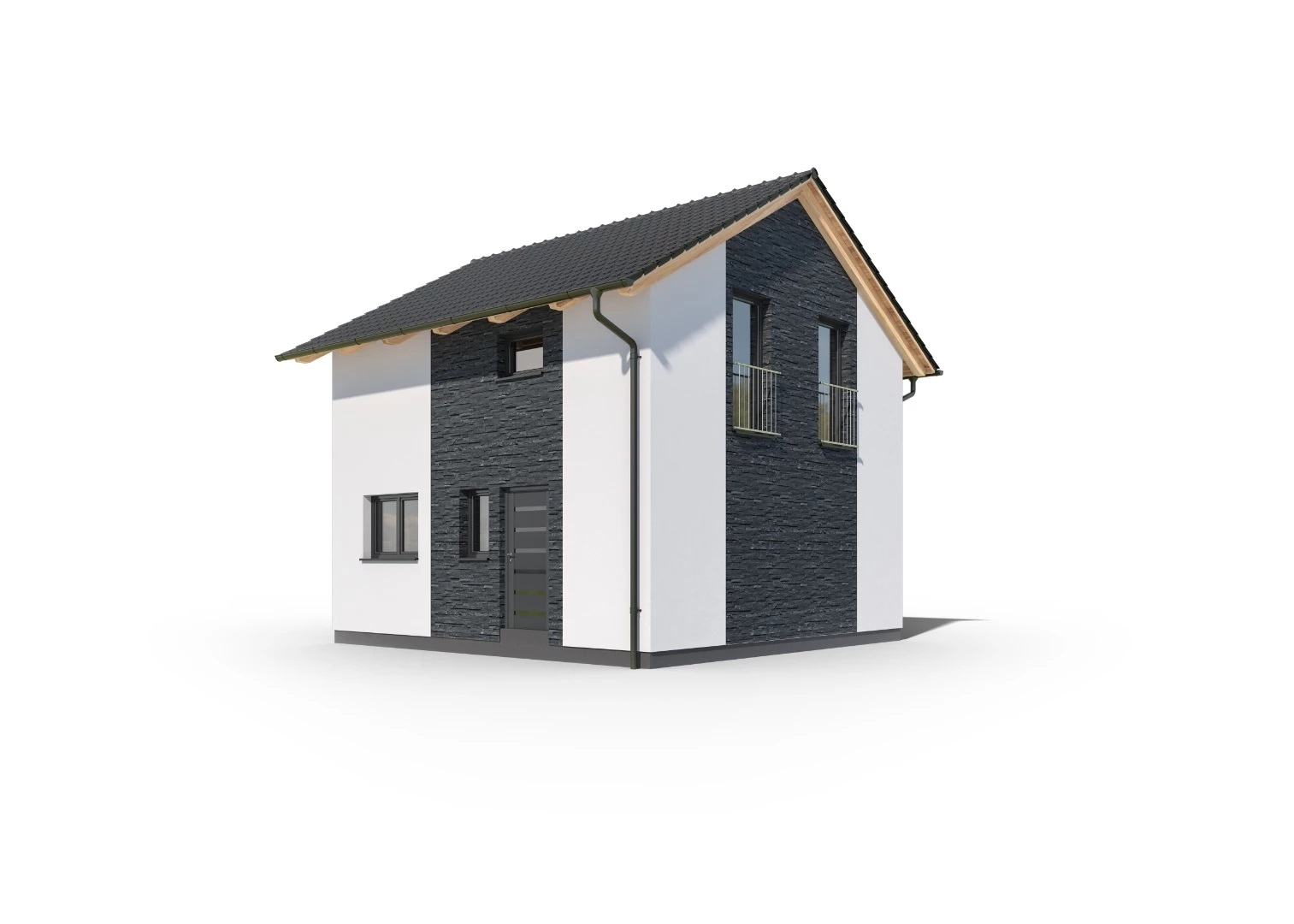 Jednoduchý, 4pokojový rodinný dům s obytným podkrovím a malou zastavěnou plochou. Dům je tak vhodný pro umístění na menší parcely. Fasáda domu může být doplněna o kamenný či cihlový obklad.