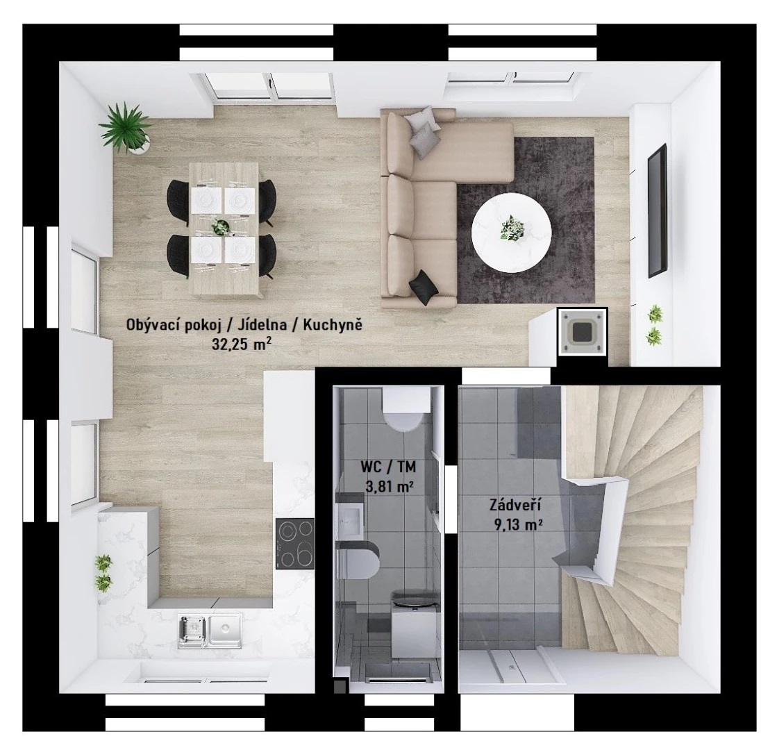 Obytný prostor s jídelnou a kuch. koutem