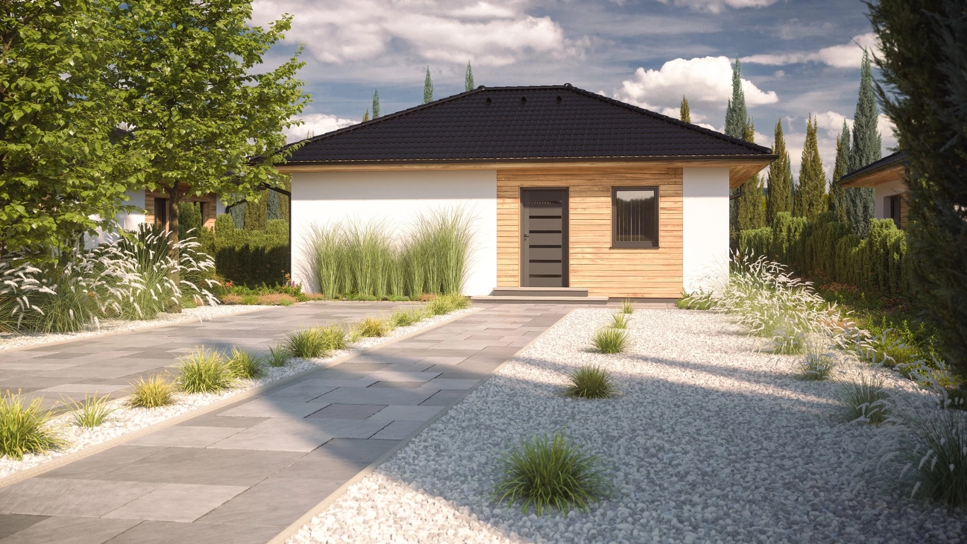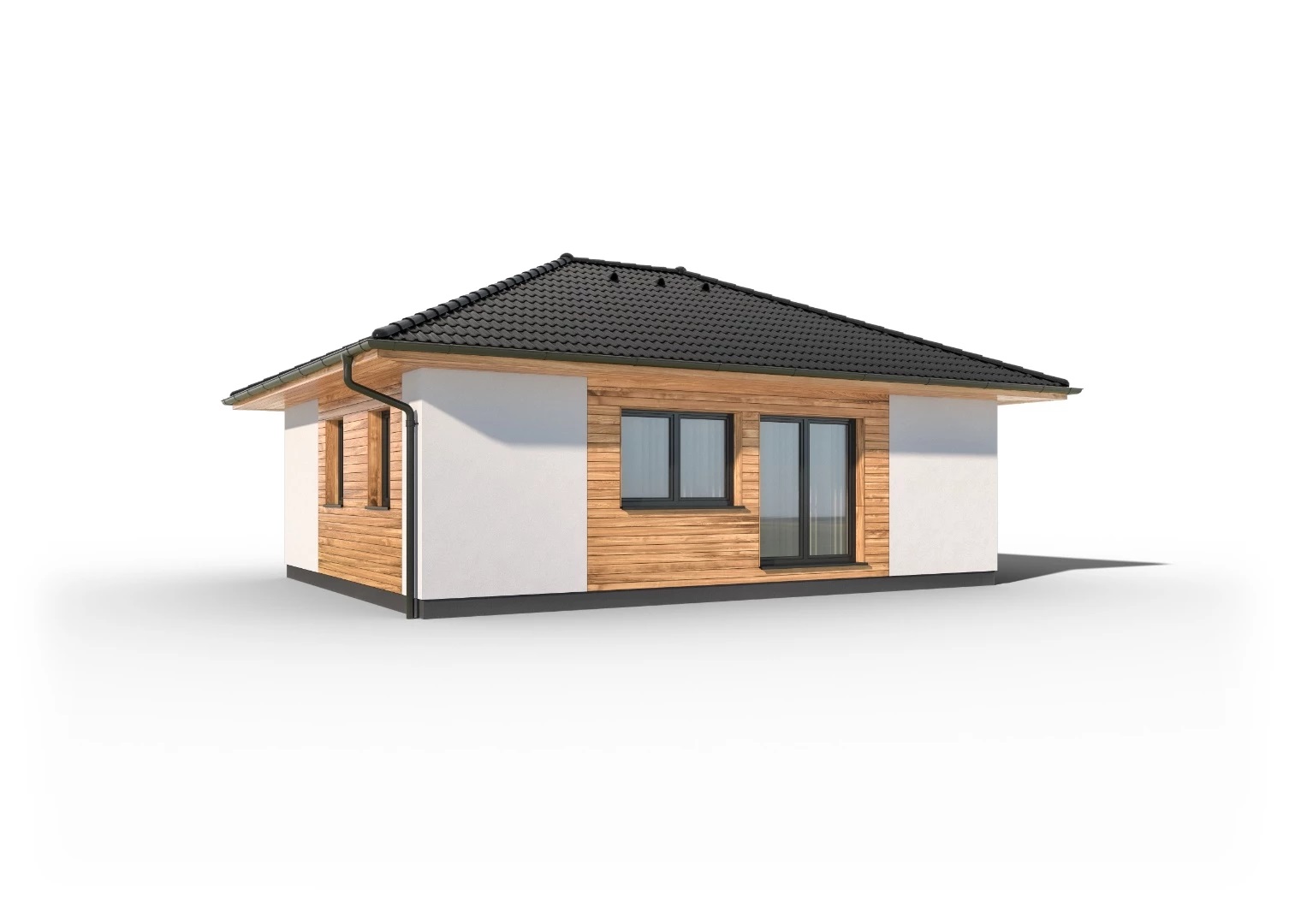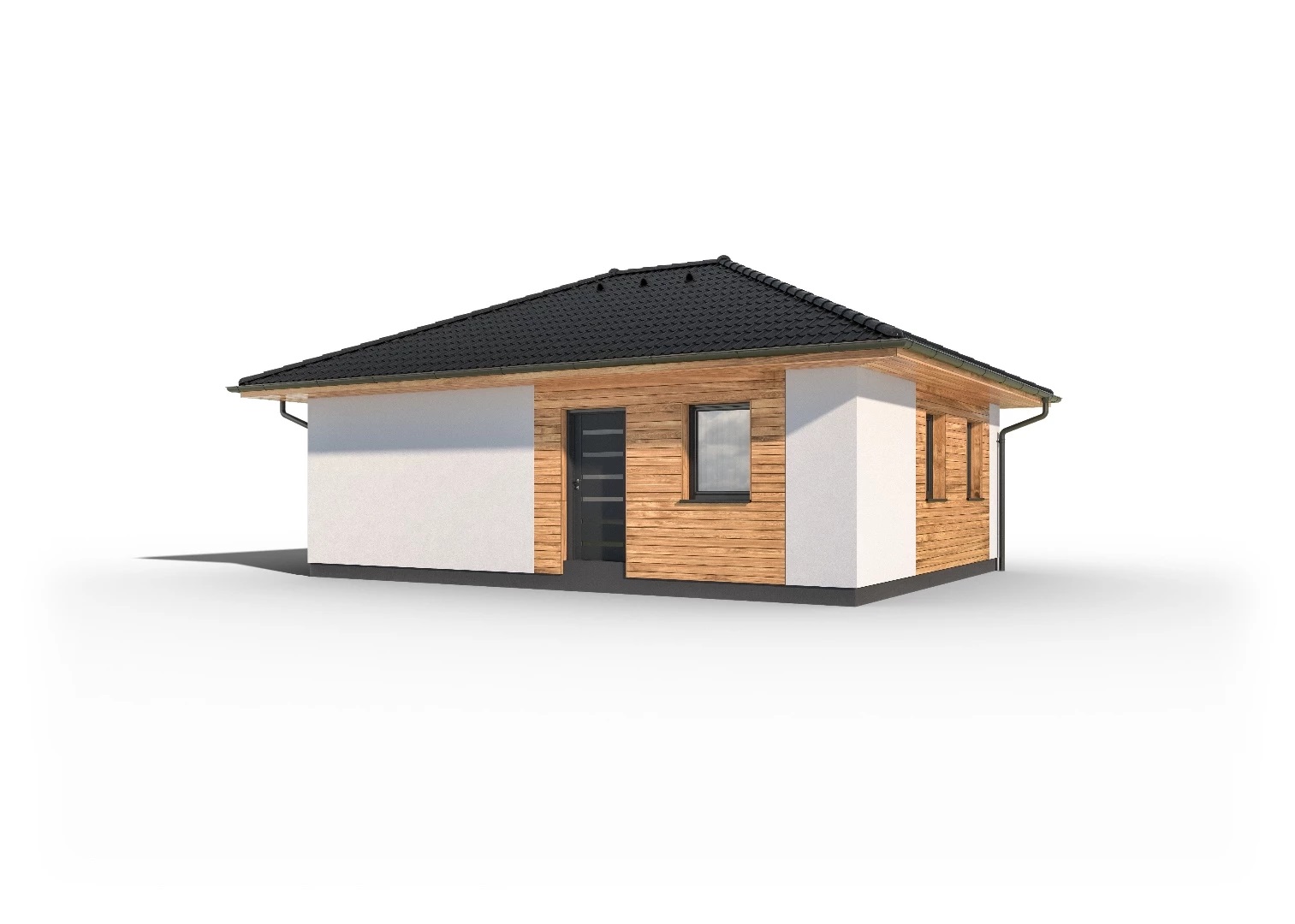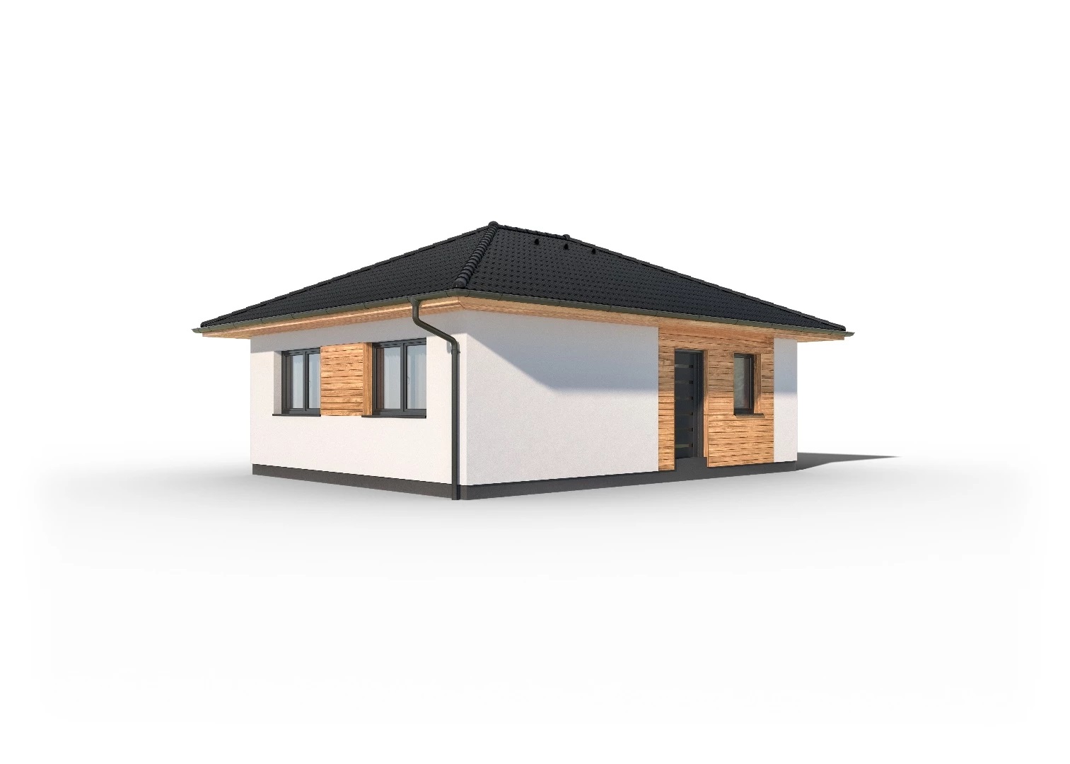 Kompaktní, jednoduchý bungalov s malou zastavěnou plochou. Použití dřevěného obkladu na části fasády dodává domu atraktivní vzhled.