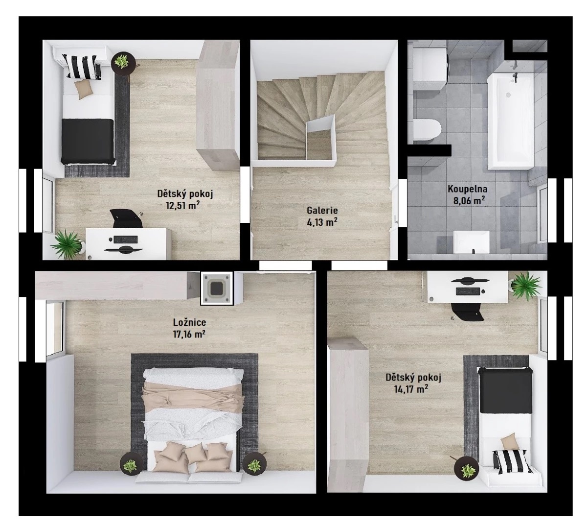V patře jsou umístěny 3 pohodlné ložnice s prostorem pro vestavěné skříně a velkorysá koupelna s vanou.