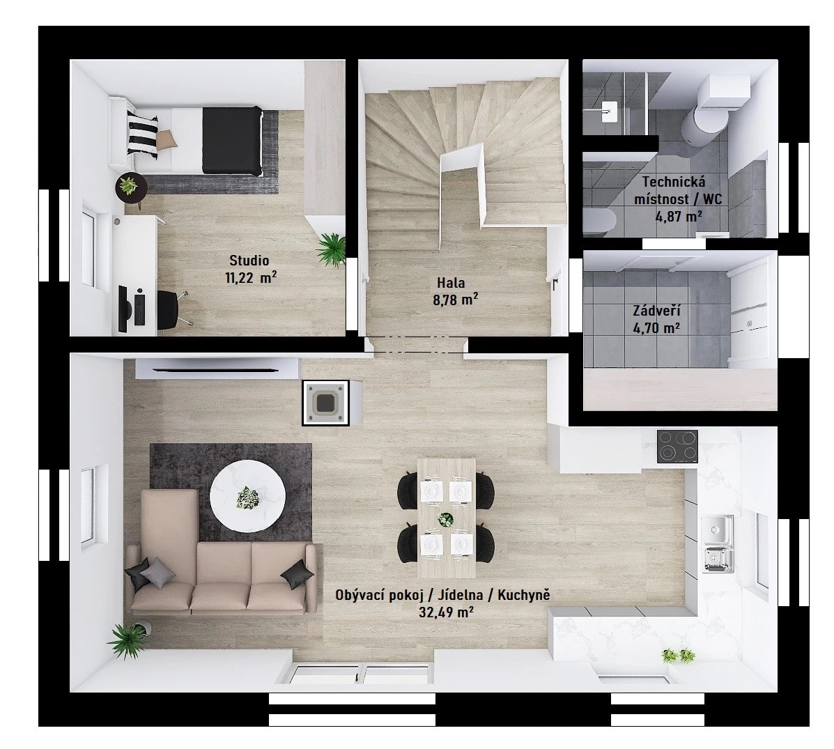 Obytný prostor s jídelnou a kuch. koutem