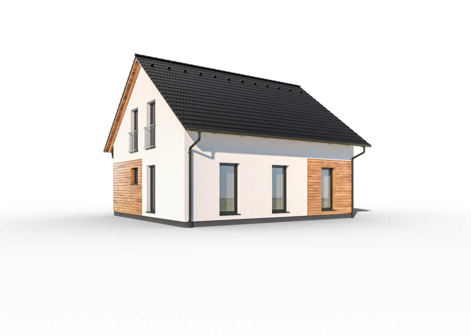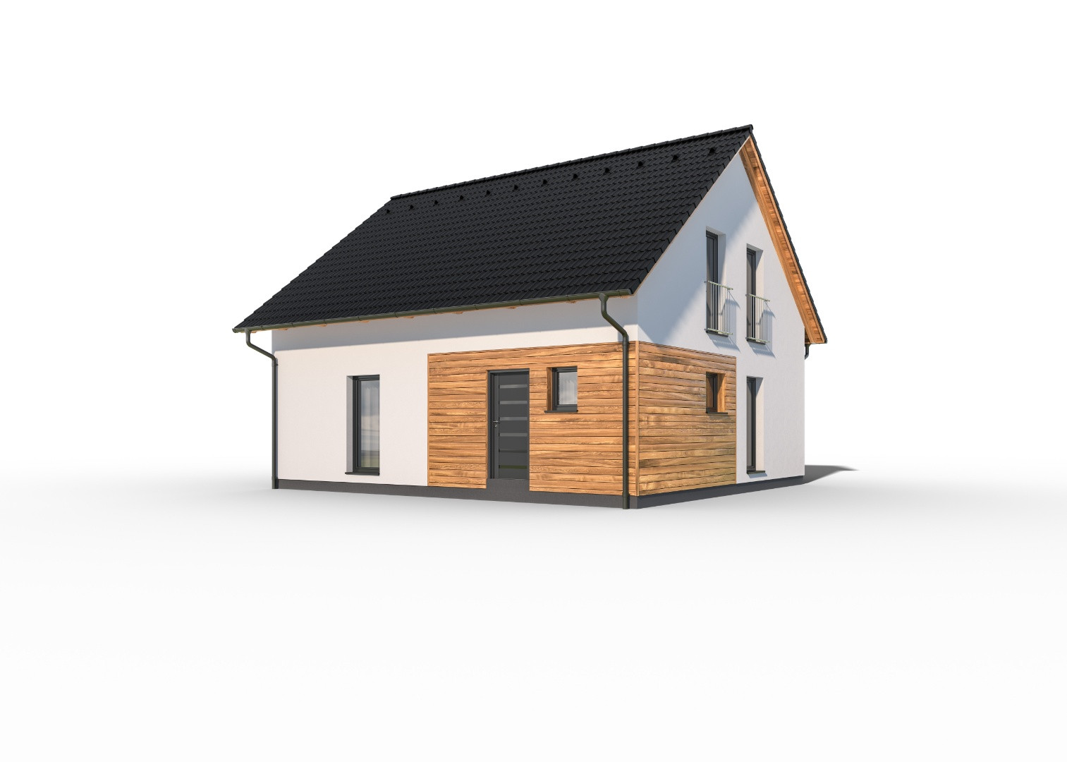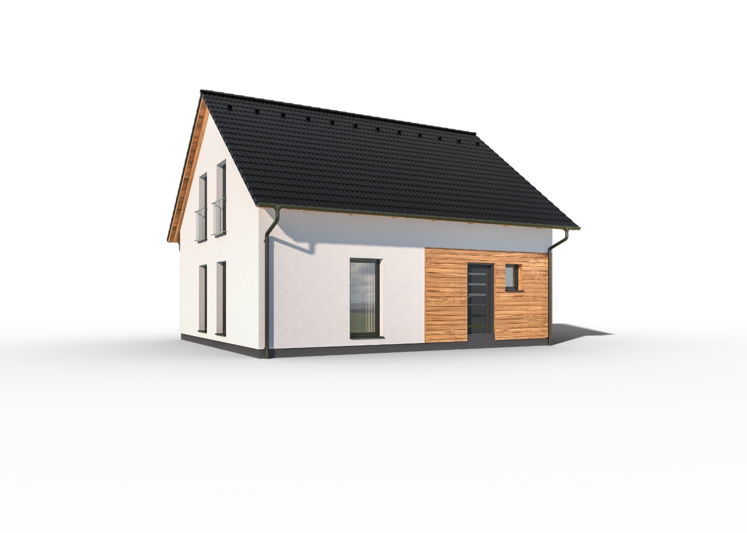 Praktický, dvoupodlažní rodinný dům tradičního vzhledu se sedlovou střechou. Dřevěný obklad na části fasády vytváří atraktivní vzhled domu. Dům bude plně vyhovovat potřebám 5-6členné rodiny.