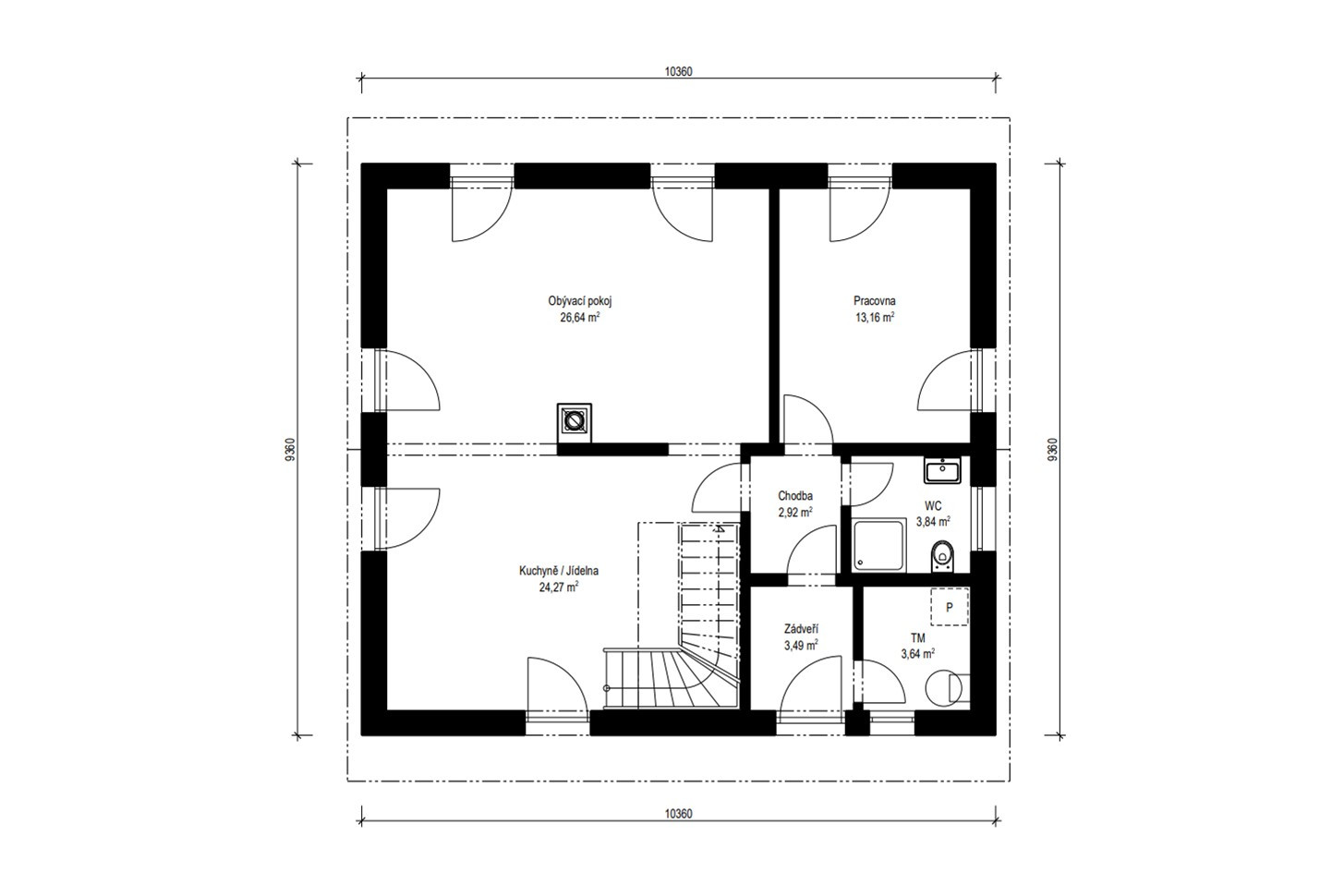 V přízemí se nachází společenská část domu, která je tvořena obytným prostorem propojeným s jídelnou a kuchyňským koutem. Dostatečné množství denního světla zajišťují francouzská okna, která nabízejí možnost vyjít z obývacího pokoje rovnou na terasu. Pro navození útulné atmosféry je zde navržen krb.