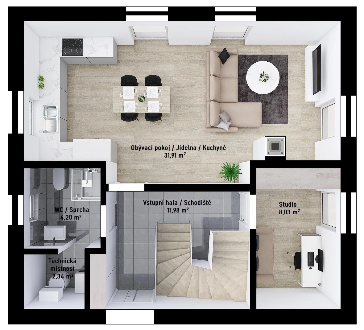 Obytný prostor s jídelnou a kuch. koutem