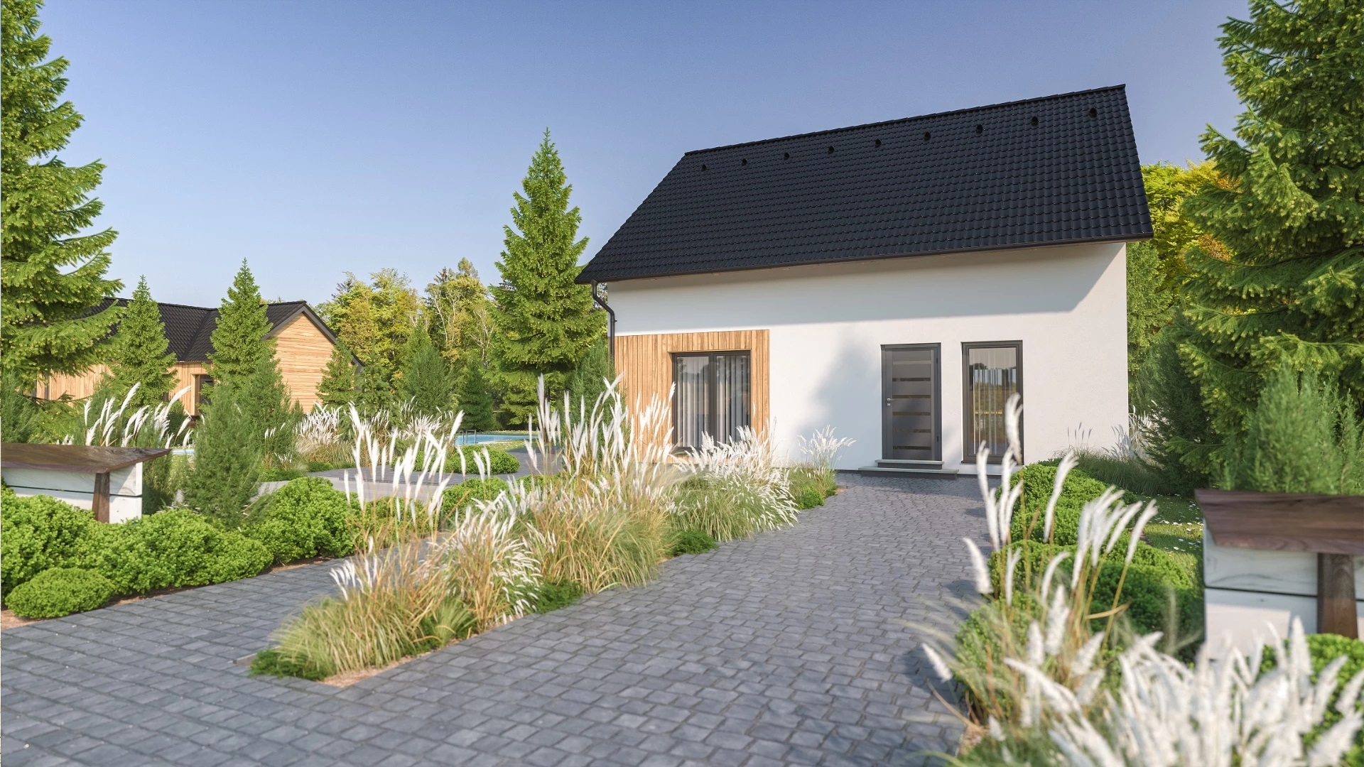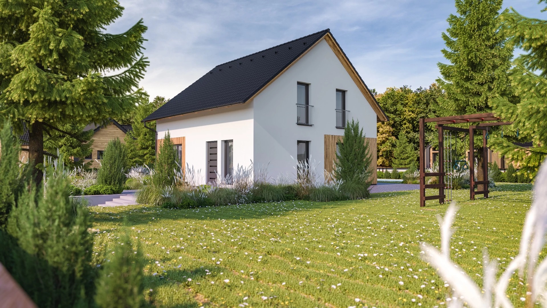 Dům k dokončení neobsahuje finální povrchy podlah a stěn (obklady, dlažby, podlahové krytiny, výmalba), zařizovací předměty koupelen a wc, interiérové dveře a zárubně, krbová kamna nebo krbovou vložku.