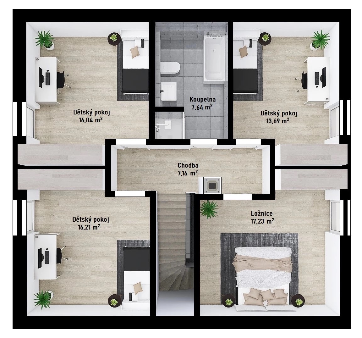 Dále zde najdeme 2 dětské pokoje, z nichž jeden může být využit také jako pracovna, pokoj pro hosty nebo třeba hobby místnost. Nadstandardně velká koupelna nabízí vanu i sprchový kout.
