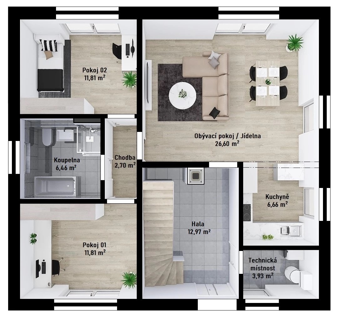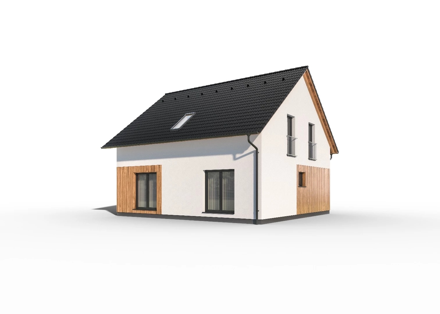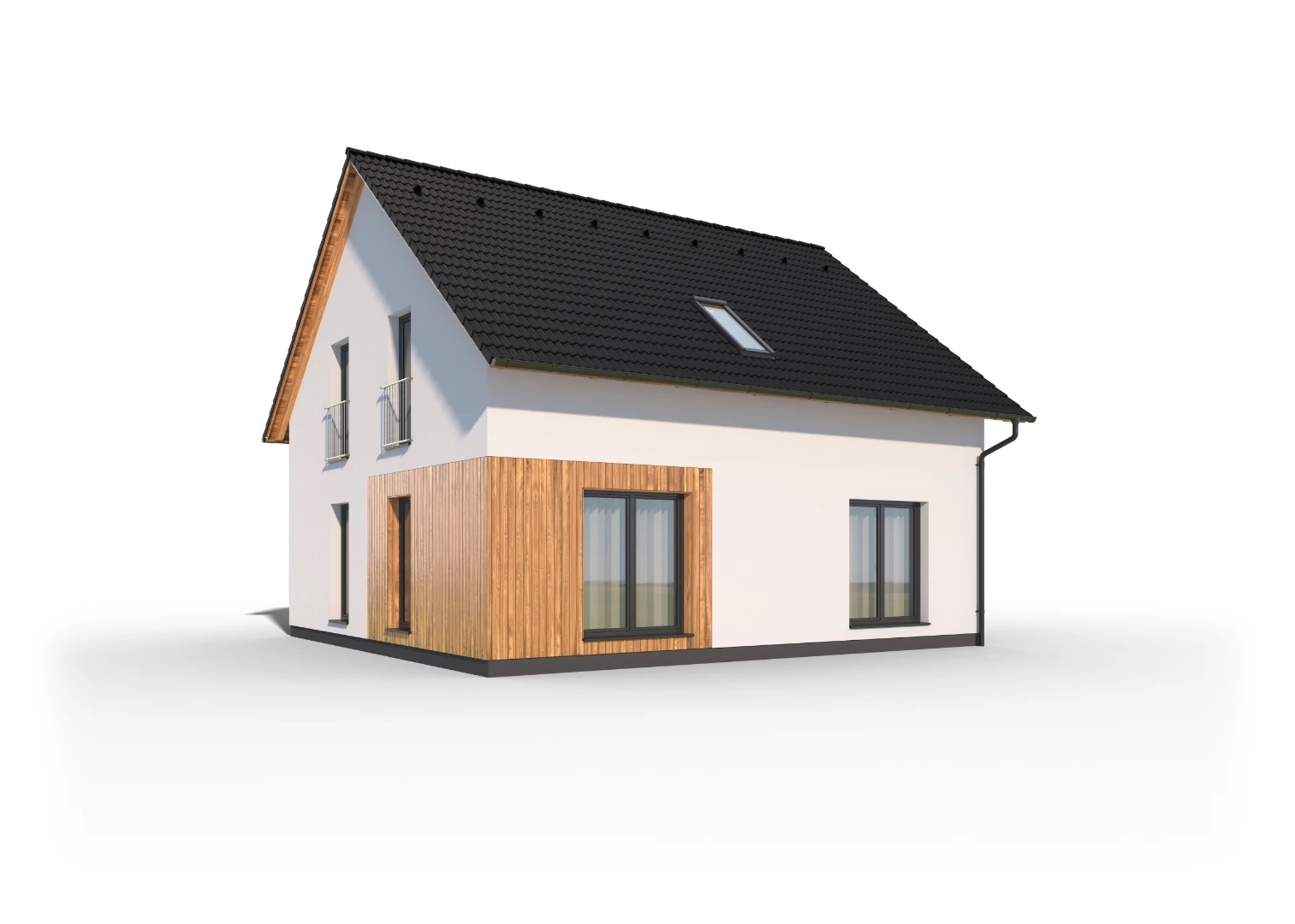 Cena včetně DPH. Cena dále zahrnuje komínový systém, tepelné čerpadlo, podlahové vytápění, centrální rekuperaci vzduchu, dřevěná nebo plasthliníková okna.