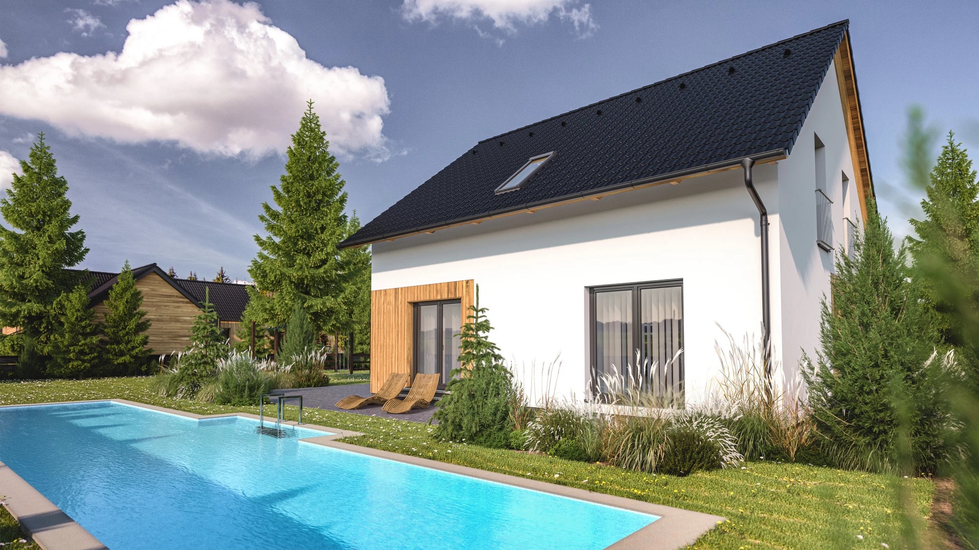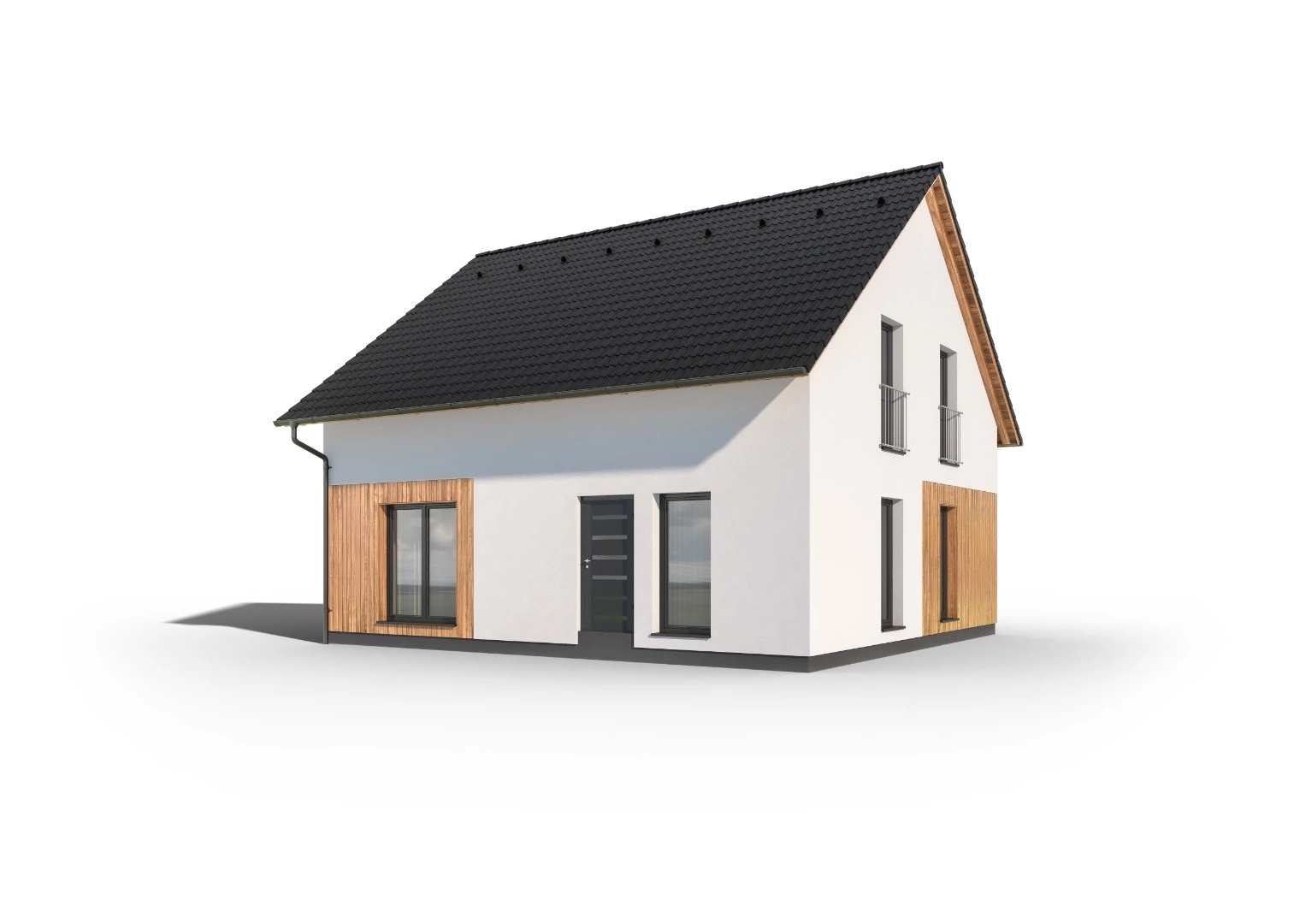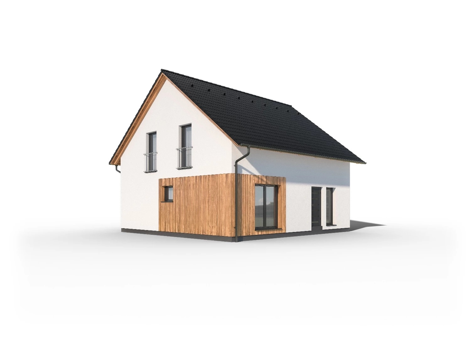 Velkorysý, 7pokojový rodinný dům klasického tvrau se sedlovou střechou a obytným podkrovím. Dům nabízí díky efektivně využitému půdorysu 7 pohodlných pokojů na zastavěné ploše pouhých 104 m2. Dřevěný obklad na části fasády dodává domu atraktivní vzhled.
