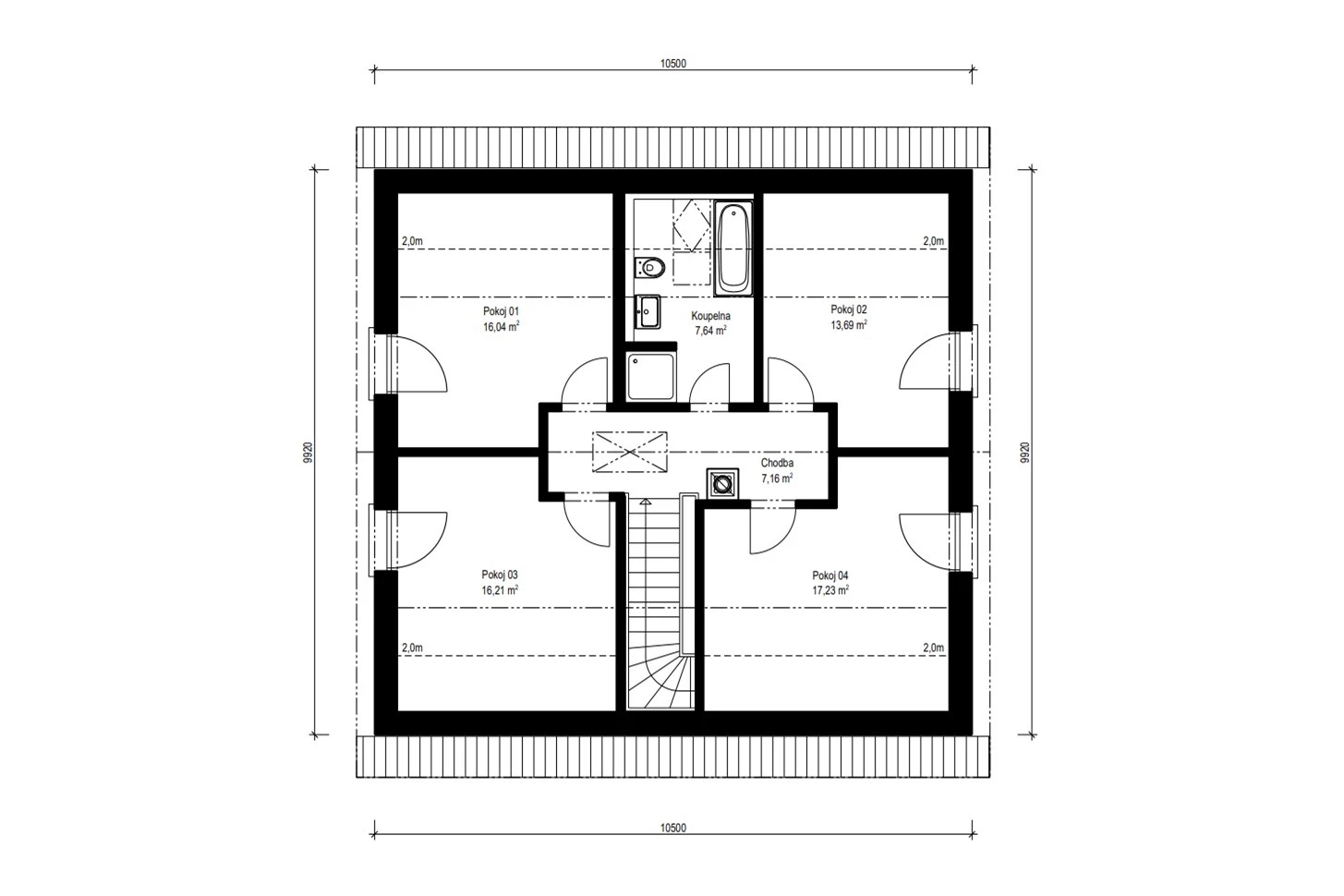 V patře jsou umístěny 4 pohodlné ložnice s prostorem pro vestavěné skříně a opět velkorysá koupelna s vanou i sprchovým koutem.